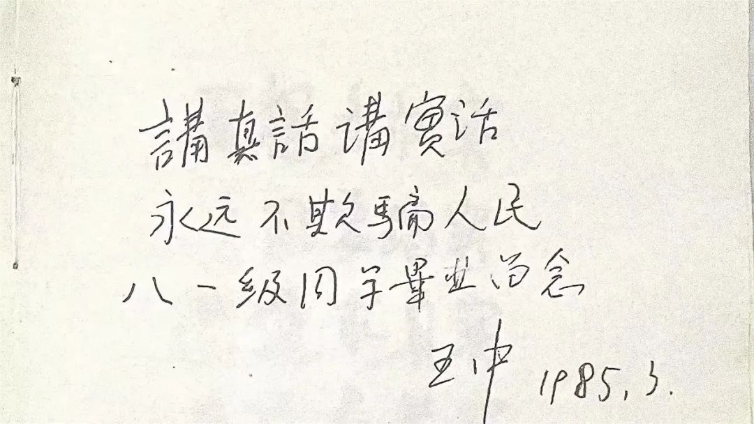 “1983年春天的一个下午,满头银发的王中由李良荣陪着,拄着拐棍,颤颤巍巍来到教室,给我们上课。班长搬了一把椅子让王中坐下。他笑咪咪看着大家,寒暄几句后,转身在黑板上写了‘为人、治学’四个大字。王中说,‘为人、治学是两个根本的问题。做好这两点,就可以无愧于一生了’。”1982级新闻干部专科班的范建生回忆了王中第一次为他们上课的情景,“当时他破例为我们班上了一学期的课。我们一直引以为豪。”