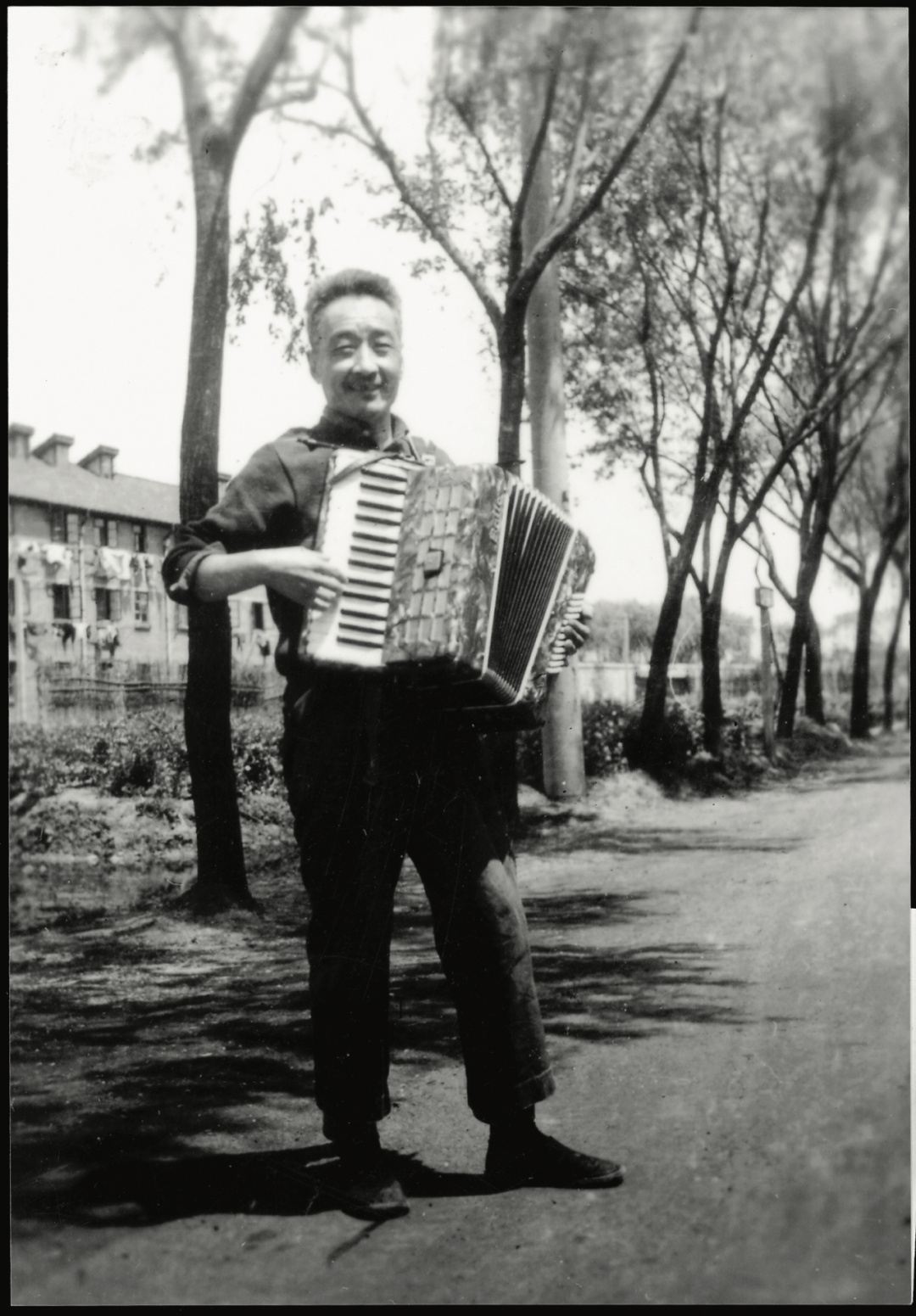 王中在拉手风琴,摄于住宅外院