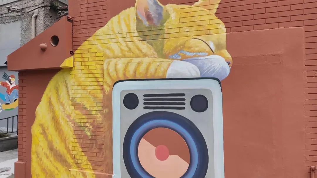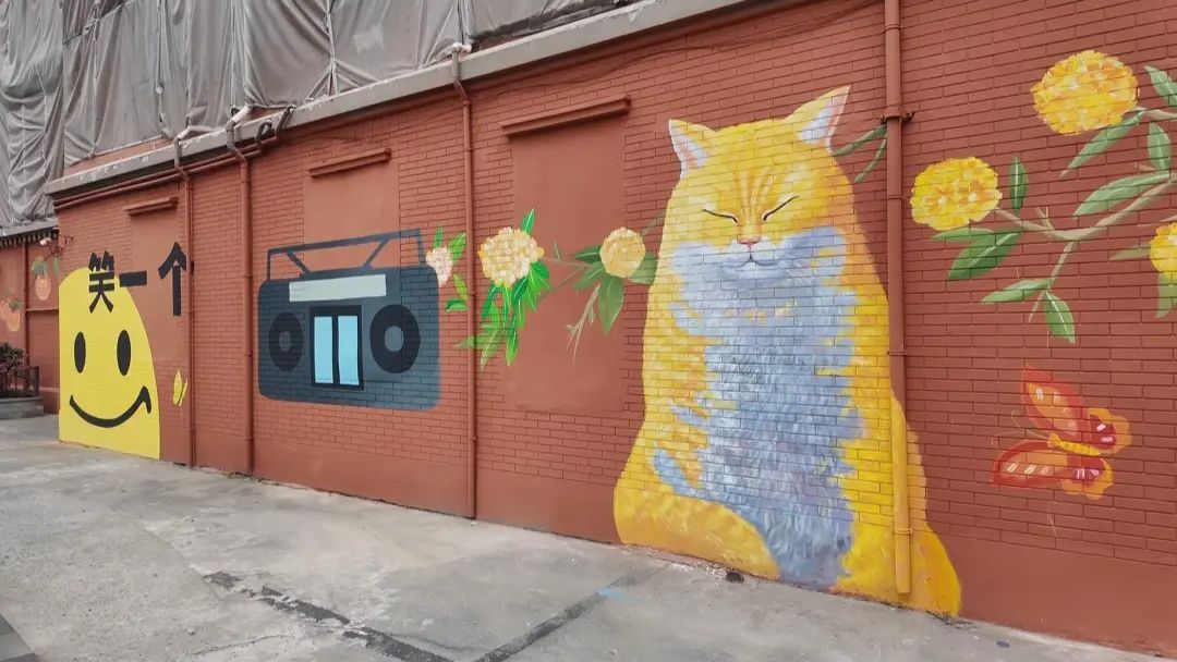 踏入这片猫猫涂鸦的奇幻世界,首先迎接你的是一只超萌大橘猫,它悠闲地半眯着眼,仿佛正沉浸在甜美的梦乡中。周围,小蝴蝶翩翩起舞,鲜花簇拥,营造出一派宁静而和谐的画面。更有那追逐蝴蝶的俏皮橘猫,以及慵懒地蜷缩在音箱上的小家伙,每一幅作品都栩栩如生,仿佛这些猫咪随时都会跃出墙面,与你来一场意外的亲密接触。路过的市民们纷纷驻足,掏出手机,记录下这份不期而遇的美好,这面涂鸦墙仿佛拥有了魔力,让人忍不住多看几眼,沉醉其中。