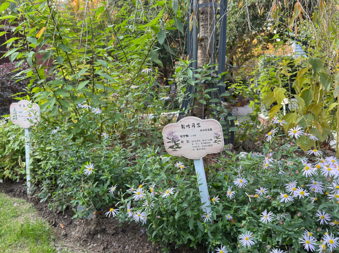 藿香、柠檬香茅、花叶香桃木、百子莲、马郁兰等多种芳香植物汇聚一堂,每种植物前都配有专属插牌,将植物名称、科属、花期、果期、识别特征一一列出。