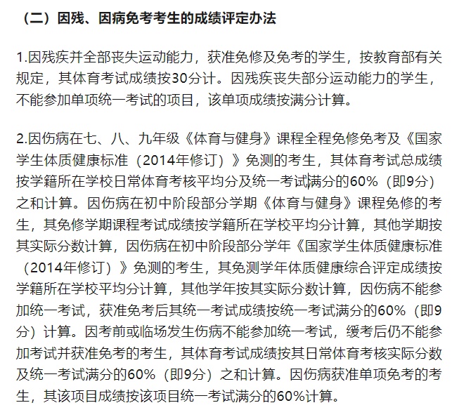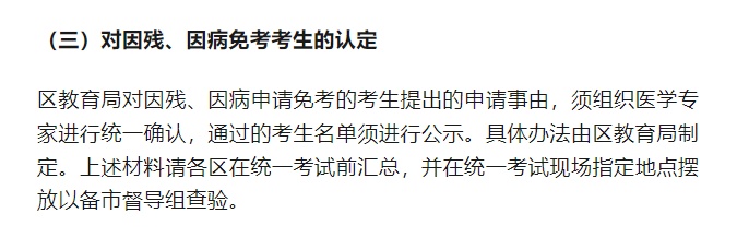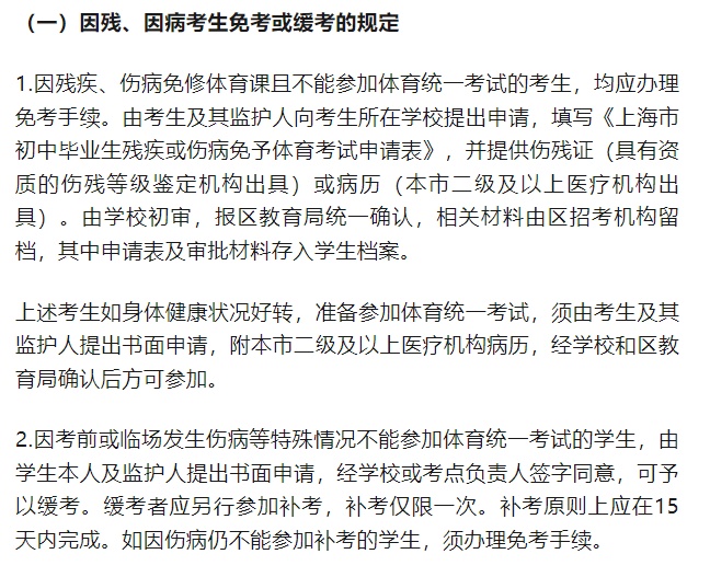 在经认定的市级及以上体育比赛中获得个人项目前六名或集体项目前三名的,可申请统一考试免考,通过后,其统一考试成绩按满分(15分)计算。相关考生名单经市级公示确认后,由各区教育局组织开展统一考试免考申请及实施工作。可认定免考的体育比赛项目按年度公布。