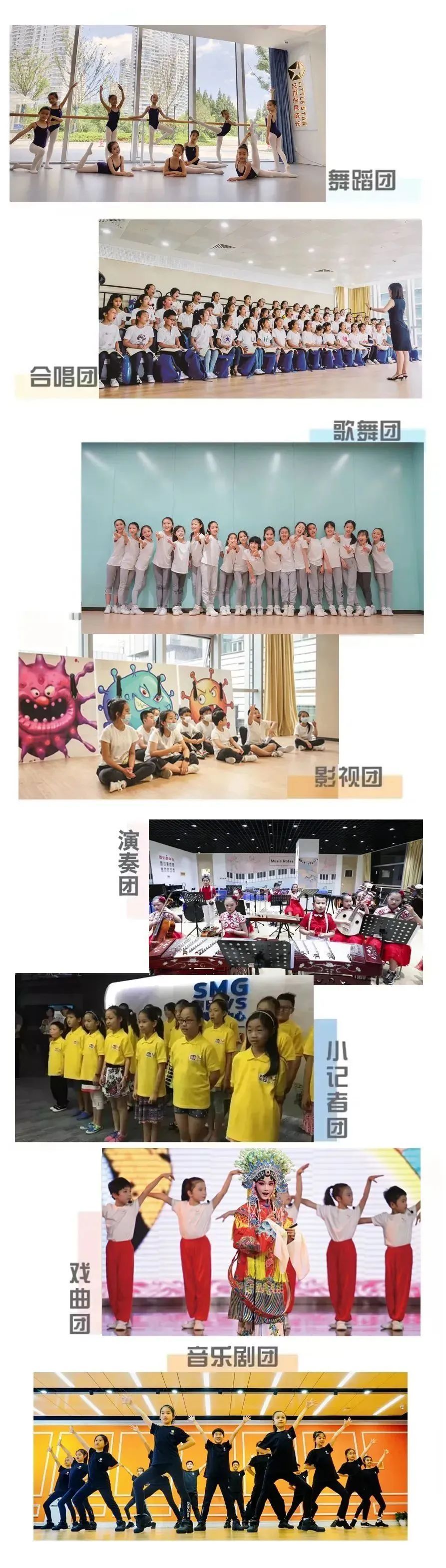 上海小荧星艺术团,隶属于SMG旗下,是驰名海内外的顶级大型少儿综合文艺表演团体。下属共有合唱团/上海少儿广播合唱团、歌舞团、舞蹈团、影视团、音乐剧团、戏曲团、小记者团、演奏团八大分团,供考生选择。