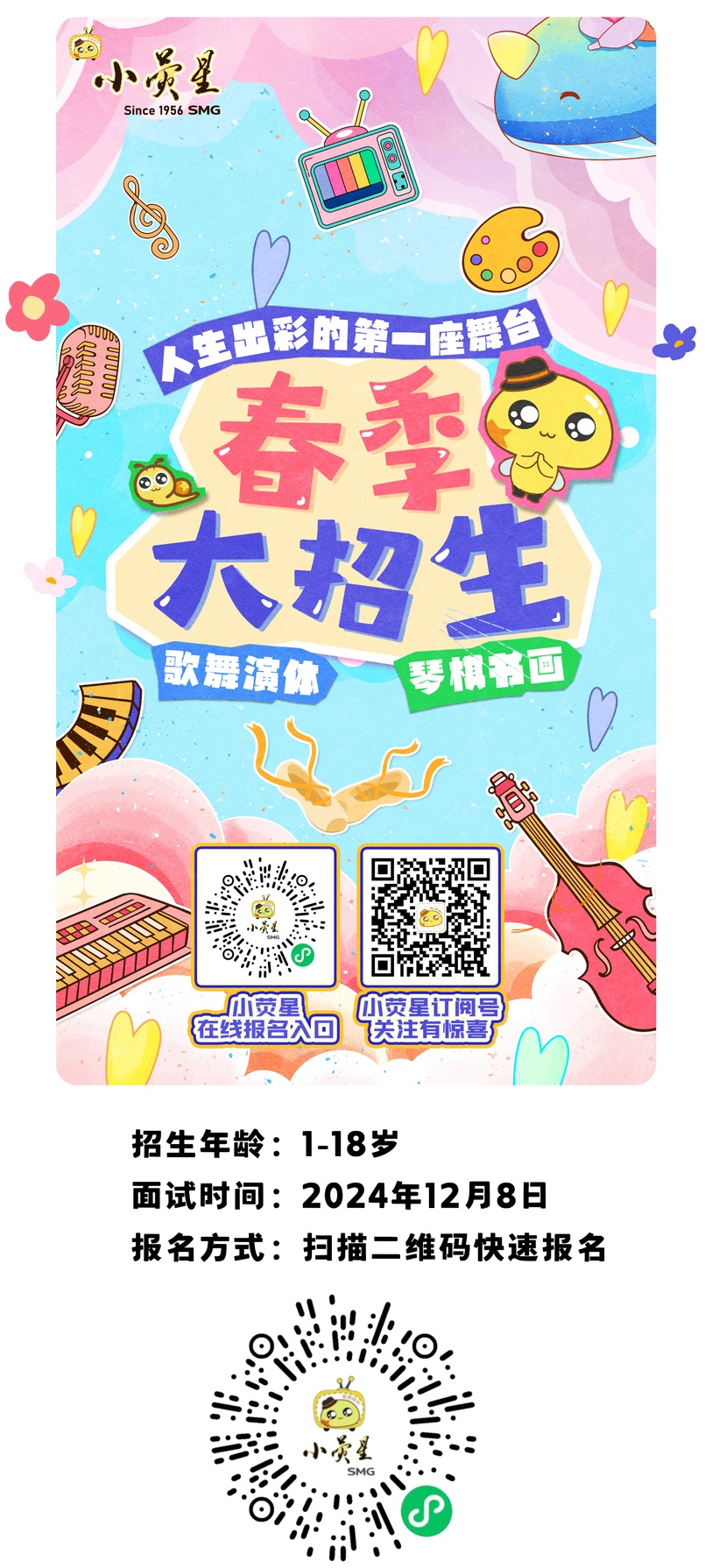 12月8日,小荧星2025年春季大招生将在浦东新区东方路2000号进行学员面试,还没有报名的小朋友们,抓住最后的机会,扫描下方二维码,赶紧报名吧!