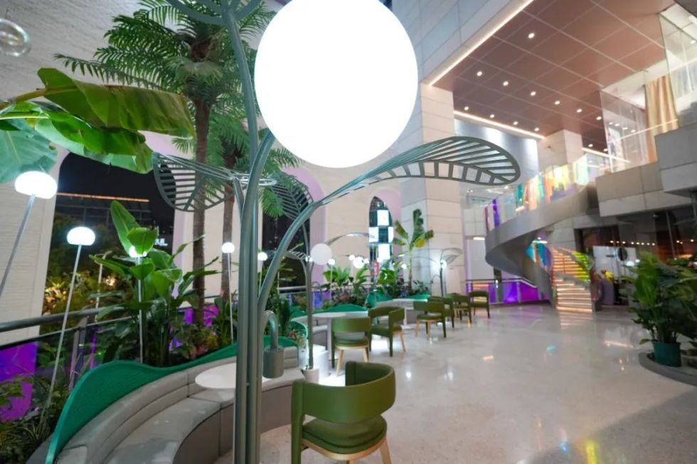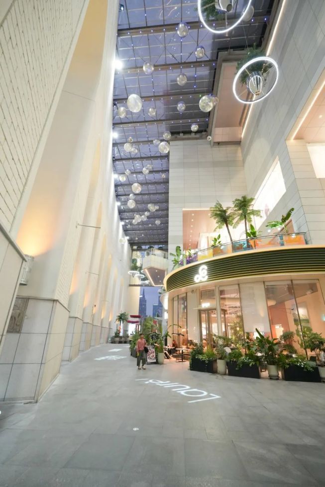 “大弯壁”下的内街区也有了新面貌。装饰灯具错落悬挂,增加空间层次感,结合休闲餐饮品牌gaga餐厅的入驻,内街区丰富绿植布置,增添休闲座椅和宠物友好装置。拾级而上,二楼观景平台及旋转楼梯层层打开,连通一至四楼,挖掘更多公共空间,构建出“大弯壁第二动线”。