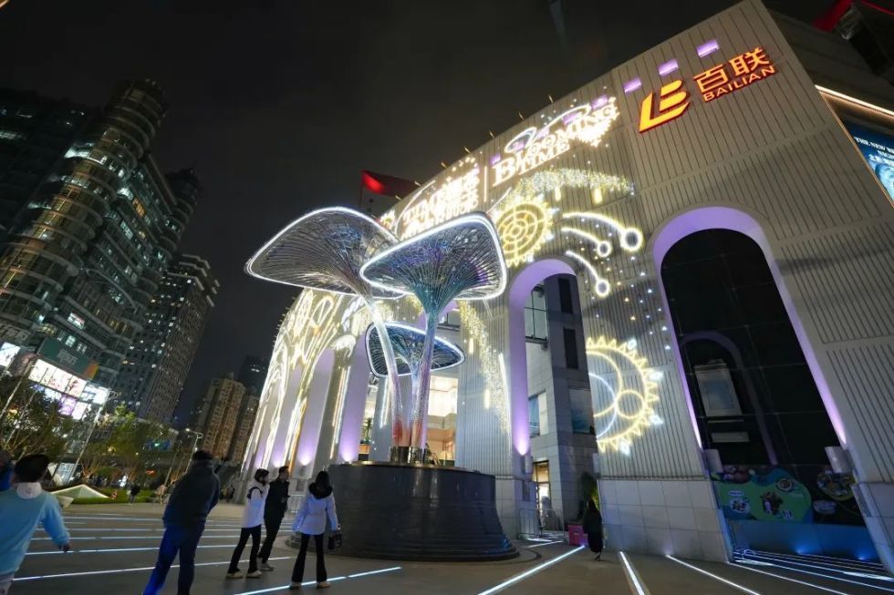 “最耗时的是灯光调试,我们和灯光顾问站在天桥上,看色温、调角度,确定最佳效果。”第一八佰伴行政保障部经理金锦宝告诉记者,为了让灯光效果更加柔和有美感,在室外广场添置了泛光灯,沿街植入“绿色山丘”与“光影绿毯”的景观设计概念,优化市政人行道、绿化带之间的自然衔接,对市民步行更加友好。