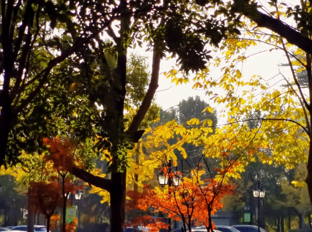 夕阳余晖洒在金黄的叶片上