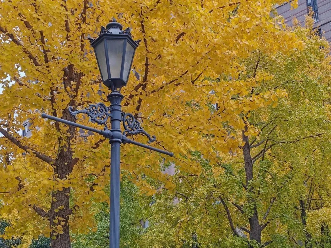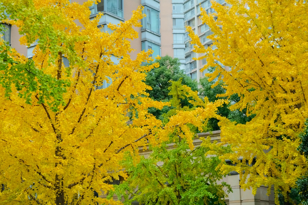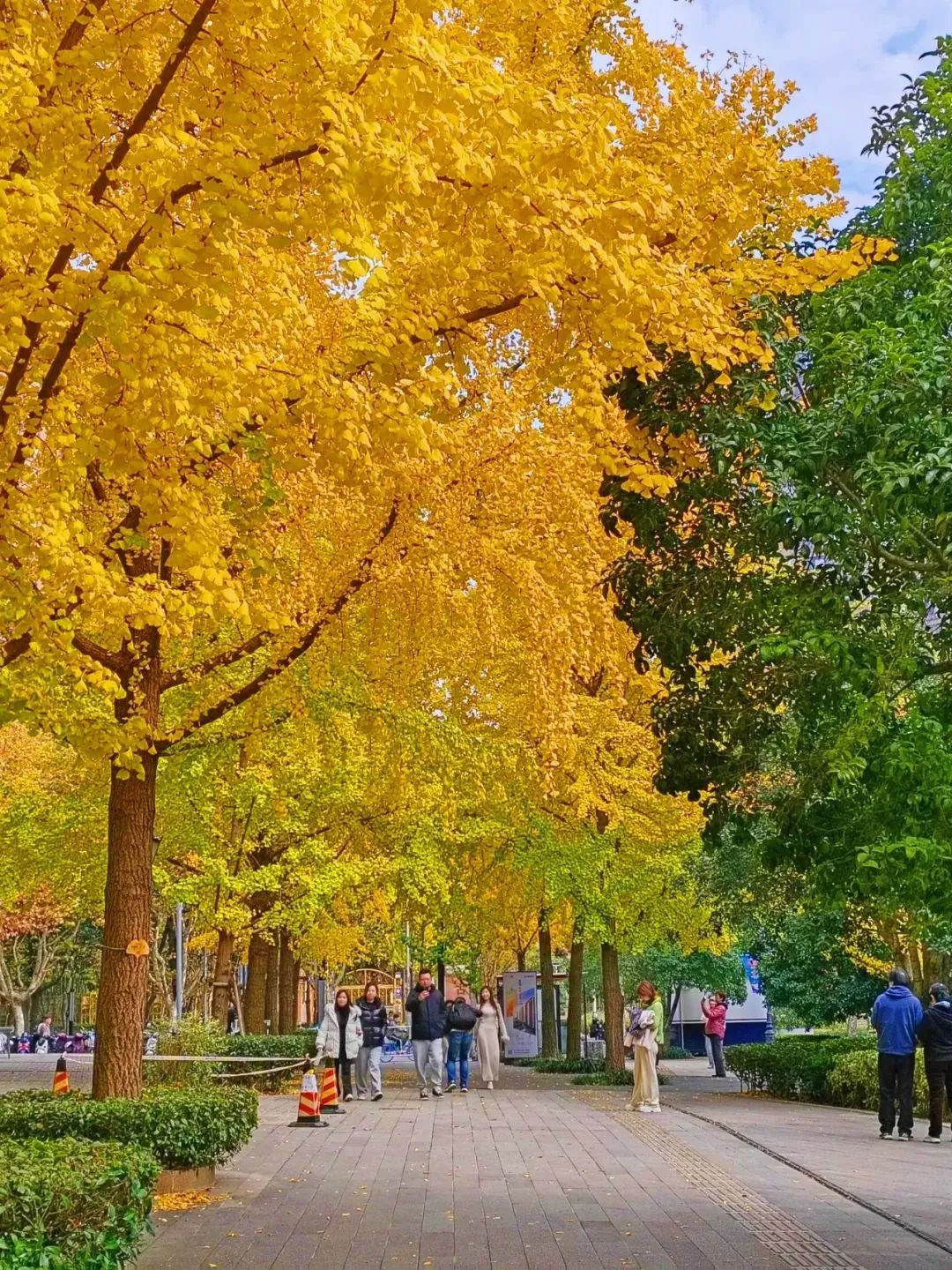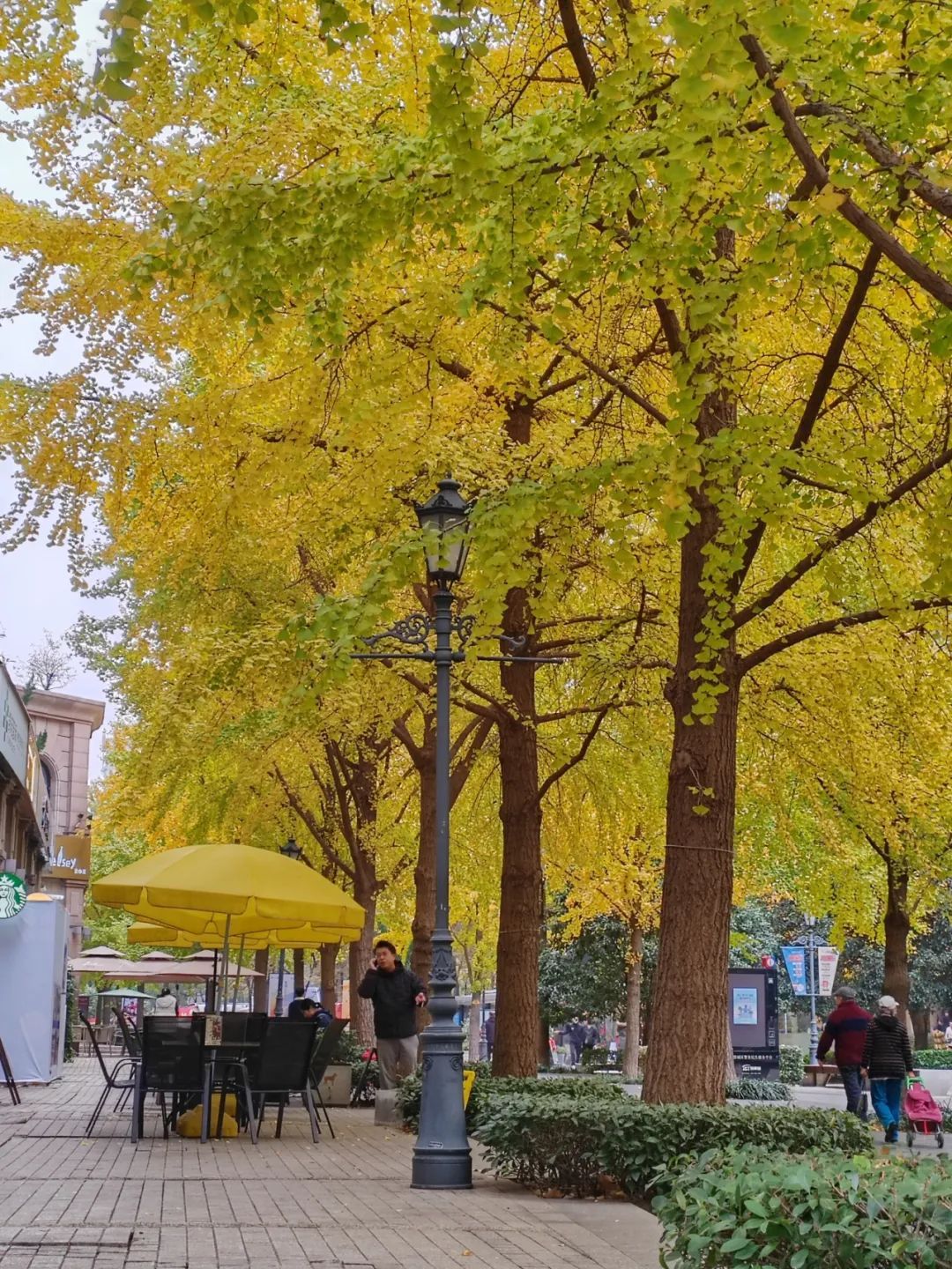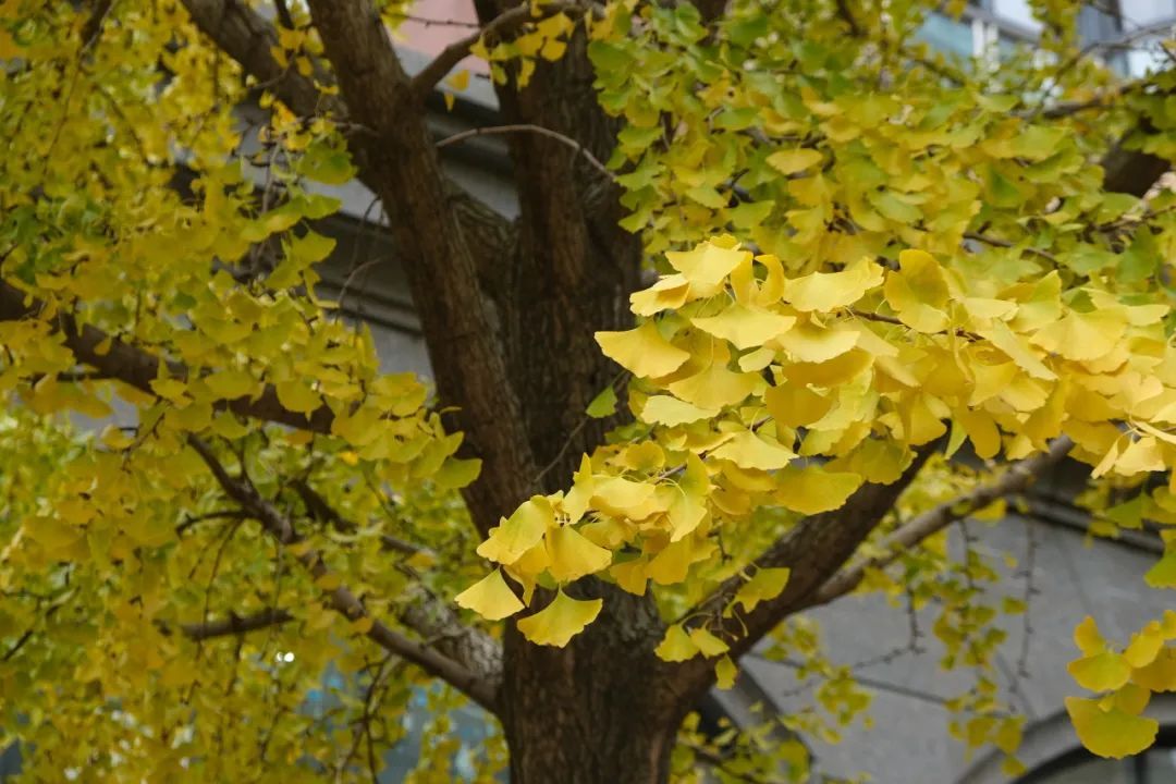 走进黄金城道,街区两旁的银杏树已经满是秋意,有的绿色与金黄色交织在一起,层层叠叠,好似一幅色彩交织的画卷,美不胜收;有的满树金黄灿烂,似扇摇曳,如金箔满枝。