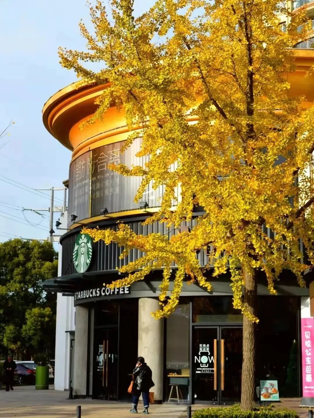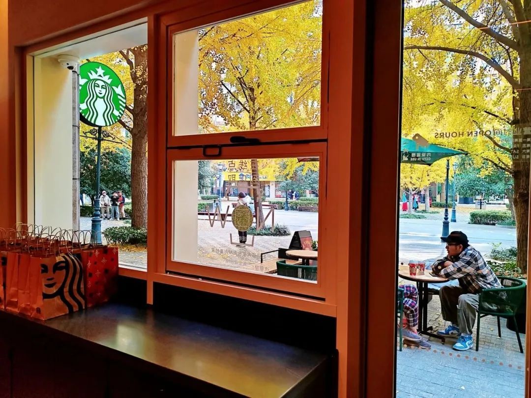 星巴克在黄金城道拥有两家门店,分别在步行街的两端,也是银杏树最密集的区域。靠近古北路的1店打造了巴洛克式的穹顶,坐在店内,不仅能感受建筑之美,向外望去满目金黄,也美得不可方物。