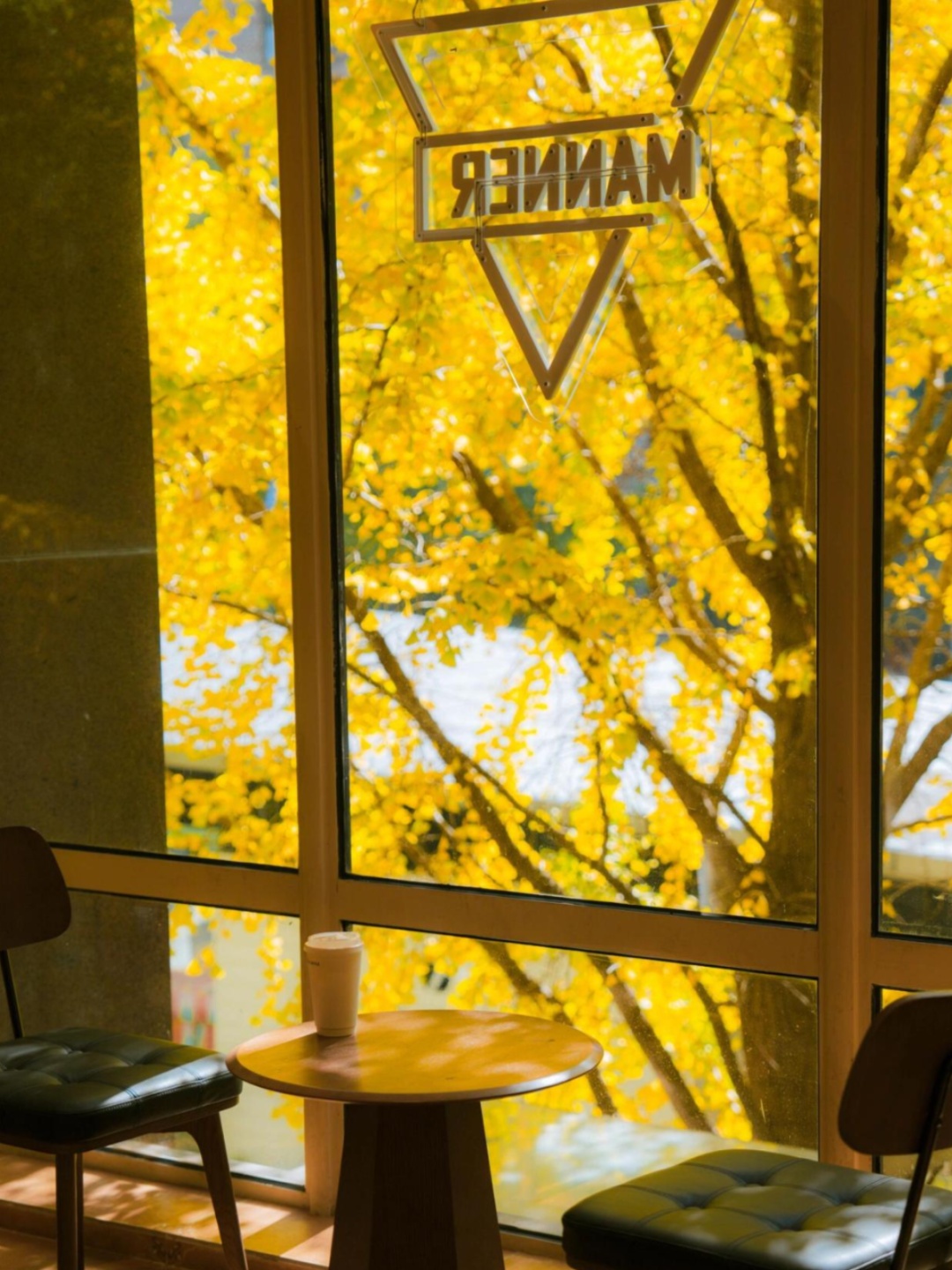 每到银杏季,Manner咖啡馆承载着来自过往游人独一份的“专宠”。走上二楼,通透的落地窗将人与景完美融合,是当之无愧的标志性观景位!