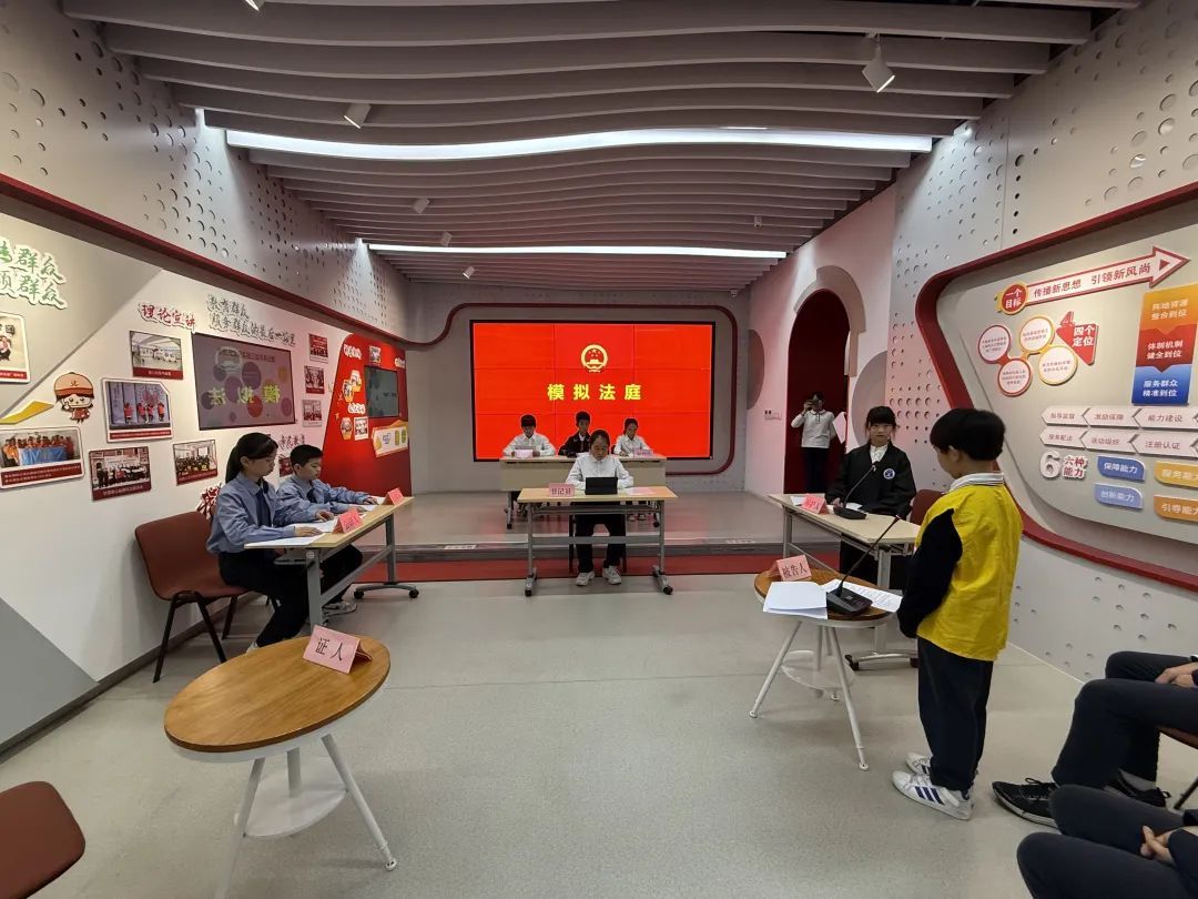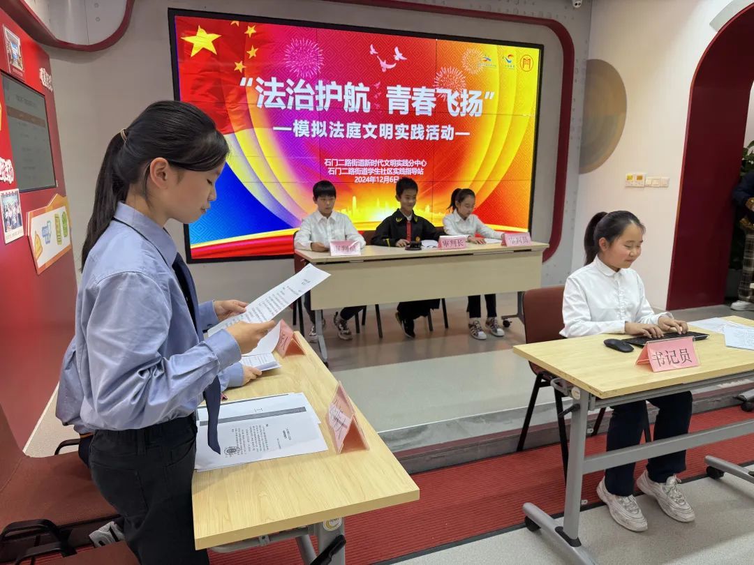 2024年12月1日至7日是第七个“宪法宣传周”,12月6日,一场名为“法治护航,青春飞扬”的学生模拟法庭主题活动在石门二路街道新时代文明实践分中心开展。12名来自上外静小的学生分别扮演审判人员、公诉人员、被告、证人、法警等角色,穿上法袍、警服,拿起法槌,体验了一把真实案件的庭审过程。