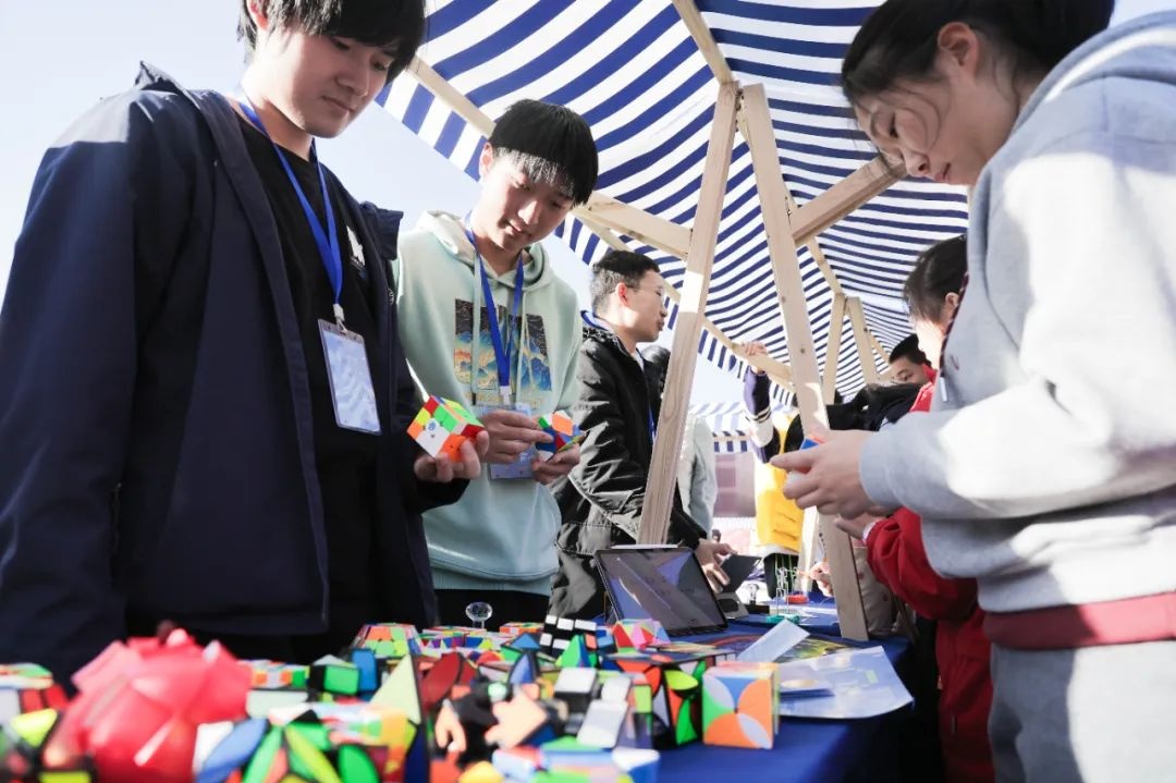 各摊位前人头攒动,另一侧的主舞台上则歌声、舞蹈与故事交织。来自复旦大学文、社、理、工、医各学科的优秀学生代表登台分享学习心得与成长故事;HipHop社等社团带来劲歌热舞;还有复旦大学科创获奖项目负责人登台分享参赛心得。