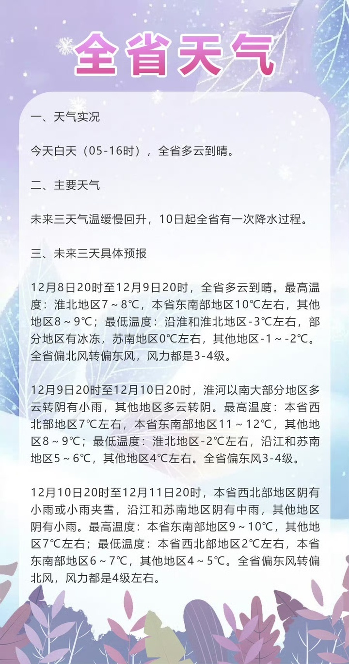未来三天气温缓慢回升,10日起全省有一次降水过程。12月8日20时至12月9日20时,全省多云到晴。最高温度:淮北地区7~8℃,本省东南部地区10℃左右,其他地区8~9℃;最低温度:沿淮和淮北地区-3℃左右,部分地区有冰冻,苏南地区0℃左右,其他地区-1~-2℃。全省偏北风转偏东风,风力都是3-4级。