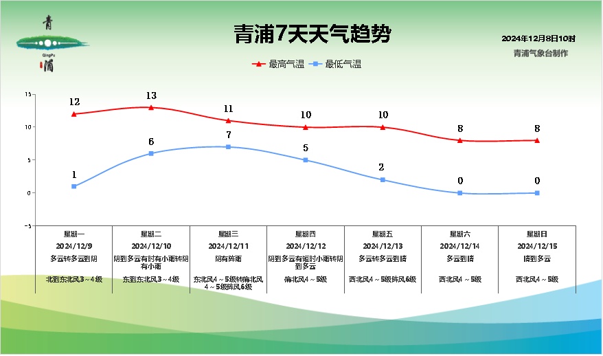 据最新气象资料分析:受地面高压控制,青浦区今明两天以多云天气为主;受低涡切变线影响,10-12日有一次降水过程,主要降水时段出现在11日前后;12-14日受新一轮冷空气扩散影响,本区风力有所增大,气温逐渐下降。