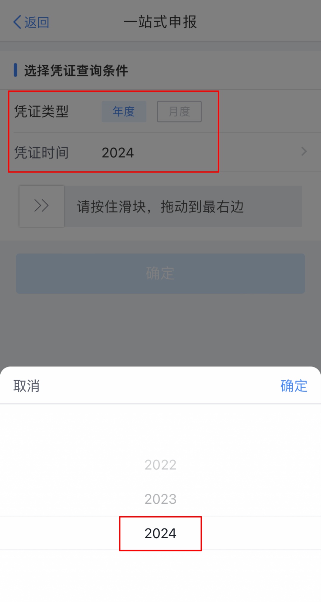 点击【“一站式”申报(免下载凭证)】,选择【凭证类型】和【凭证时间】,按住滑块拖到最右边,点击【确定】,系统即可自动查询个人养老金缴费凭证信息。