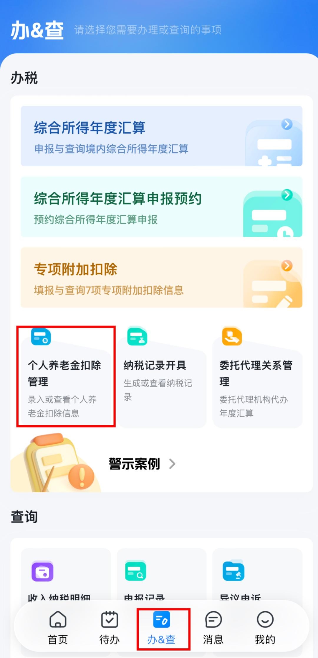 登录个人所得税App,进入【办&查】页面,点击【个人养老金扣除管理】,进入填报页面。