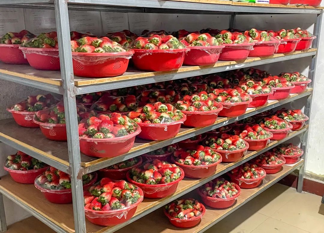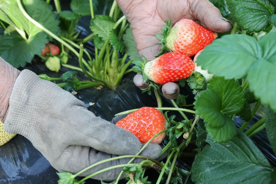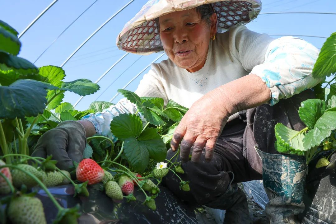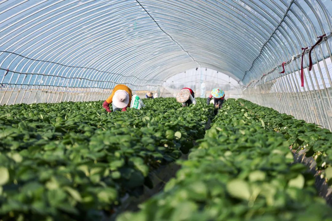 近日,在枫泾镇,不少大棚草莓园里的头茬草莓开始成熟,为初冬的“果篮子”增加了一点“甜”。在俞汇村的某合作社,草莓大棚内一片繁忙景象,农户们正忙碌地采摘着成熟的草莓,只见一垄垄的绿叶间点缀着点点红光,在黑色地膜的衬托下显得格外耀眼。农户们戴着草帽,穿梭在田垄间,小心翼翼地将成熟的草莓采摘下来,动作娴熟又迅速。一个个外形饱满、香甜可口的草莓被装入筐中,准备上市销售。“最近,每天都能采收百十来斤。” 据合作社负责人金雪峰介绍,今年合作社共种植了15亩草莓,品种为“天仙醉”,属早熟品种。“在今年8月中上旬定植的,比往年略早几天。今年天气适宜,草莓长势非常好,在11月中旬就开始陆续上市,由于刚上市,目前合作社的草莓供不应求。”据悉,为确保草莓抢先上市,育苗移栽后,合作社在田间管护上下足了功夫,通过对大棚内的温度、湿度、光照等环节进行实时调控,最大限度为草莓提供适宜的生长环境。“头茬草莓的个头、品相、口感更好,经济价值也更高。” 金雪峰告诉记者,“目前,合作社内草莓每天都是现采现售,现在价格相对高些,主要销售给爱尝鲜的老客户,也陆续有游客上门亲自体验采摘。”