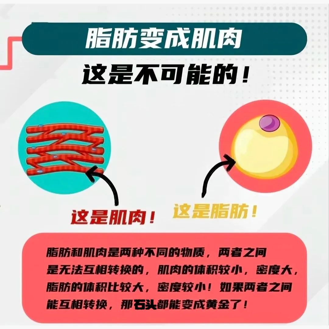 首先,需要明确一点:肌肉和脂肪是两种截然不同的组织,在结构、生化特性以及功能上都有着显著的差异。脂肪主要是由甘油三酯组成,主要功能是储存能量,而肌肉则是由肌原纤维构成,主要功能是产生力量和运动。这两种物质在生理学中有着明确的区别和作用,它们的细胞数量都是一成不变的,变胖或者变瘦,变化的只是它们的体积。因此,从科学的角度来说,它们是无法直接相互转化的。