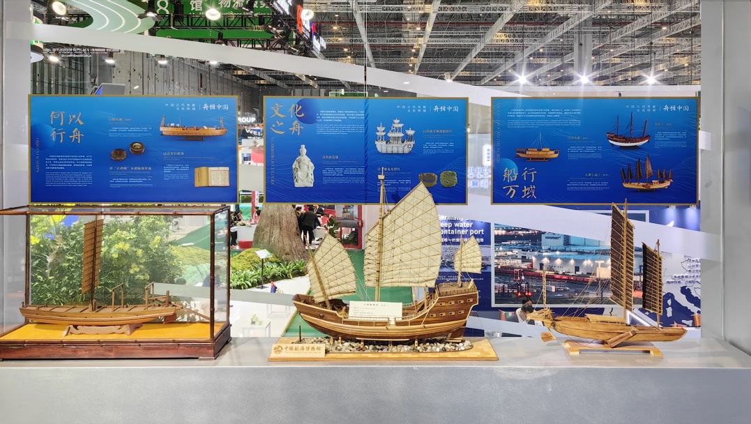 中国航海博物馆协同中国远洋海运集团有限公司,以传播中国灿烂舟船文化与航海技术为要义,精选“舟楫中国展”搭配福船、背网船等3艘精美船模模型,在中国远洋海运集团有限公司展区中专辟区域,从造船航行技术发展、航运历程、承载文化等角度,多层次展示古代中国舟船文明的源流衍变,为中远展台营造了古今映照的航海文化氛围。