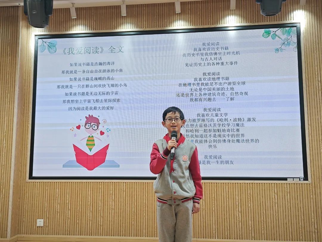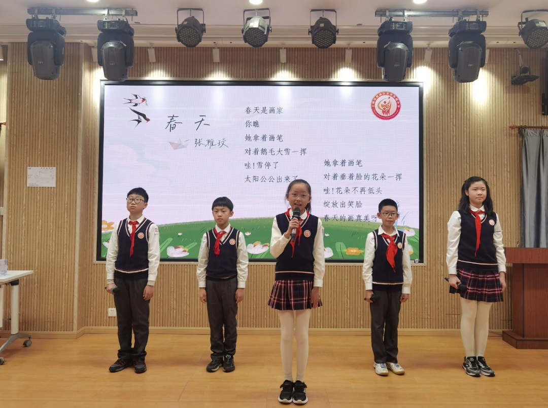 学校四年级和五年级的学生也上台朗诵了自己的作品。五年级男生黄文柏分享了原创作品《雷公公来了》,他告诉第一教育:“一天上学时,突然下起了大雨,还打雷了,我以此为灵感创作了这首诗。平时,班主任经常会和我们一起读诗,一起欣赏学长学姐们写的诗,也鼓励我们多观察生活中的现象。”