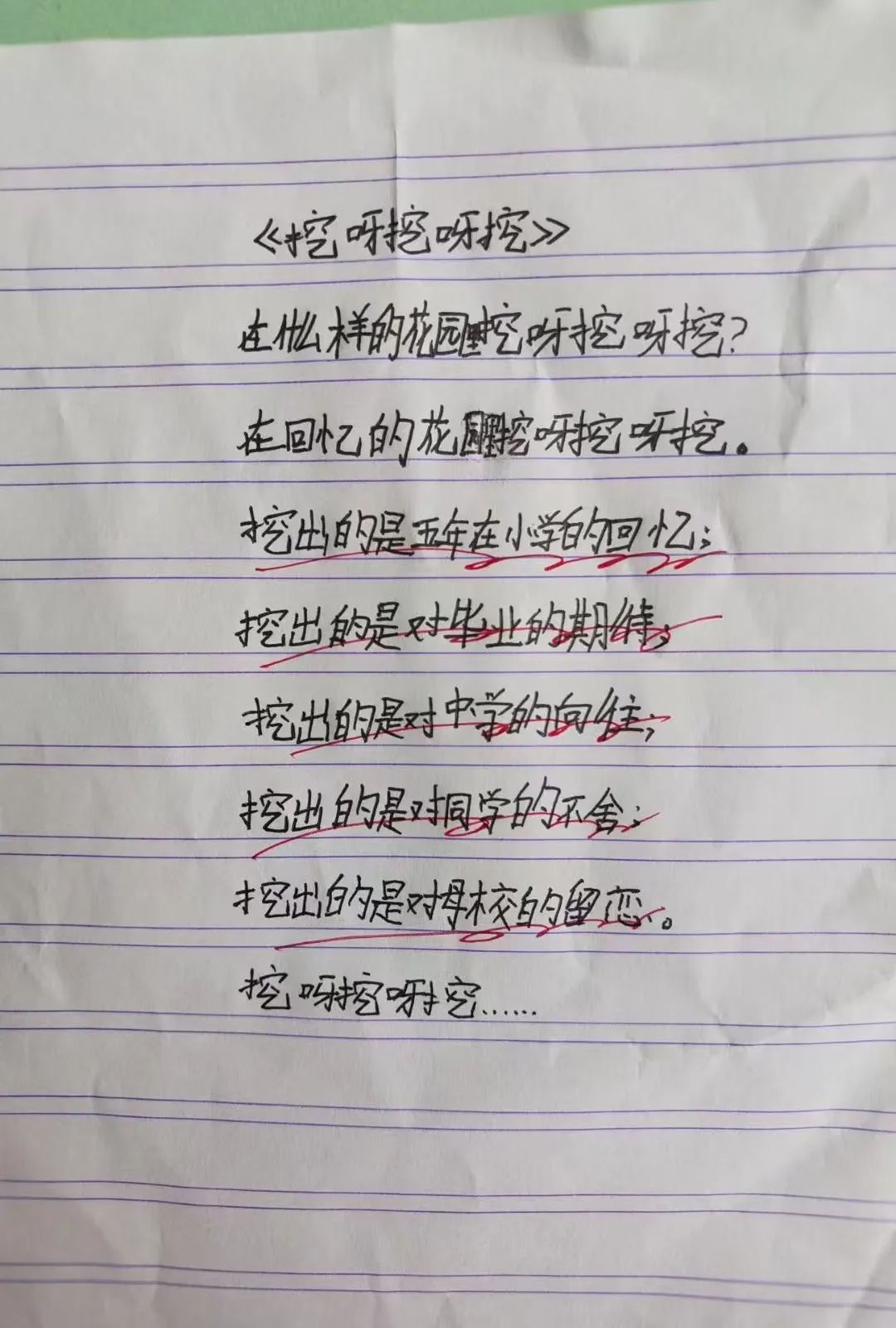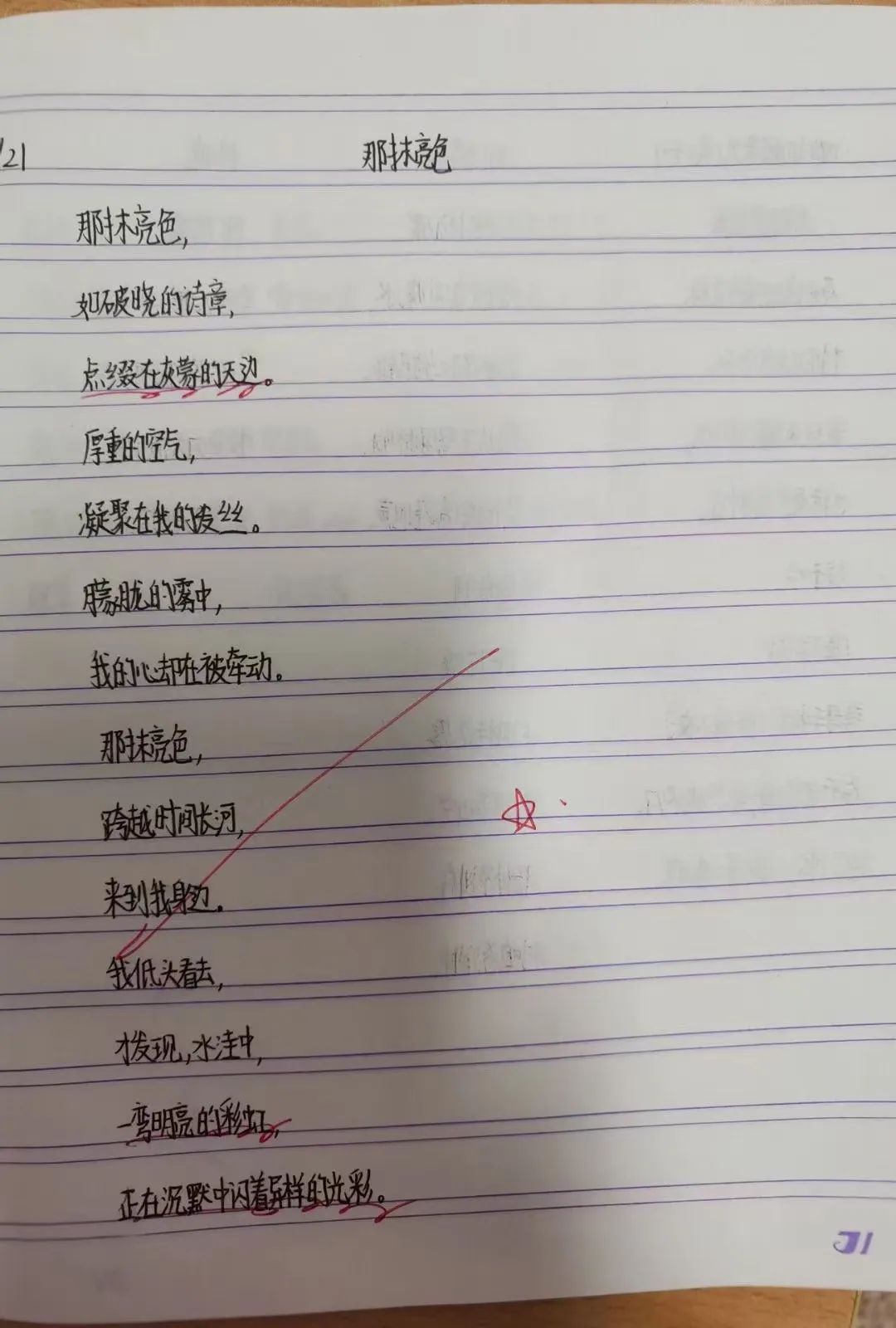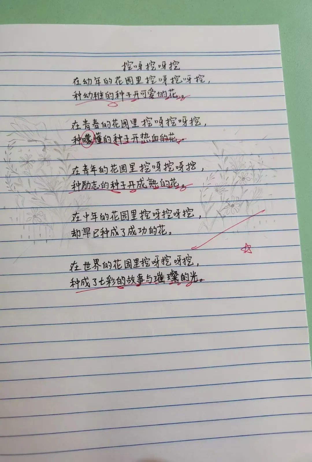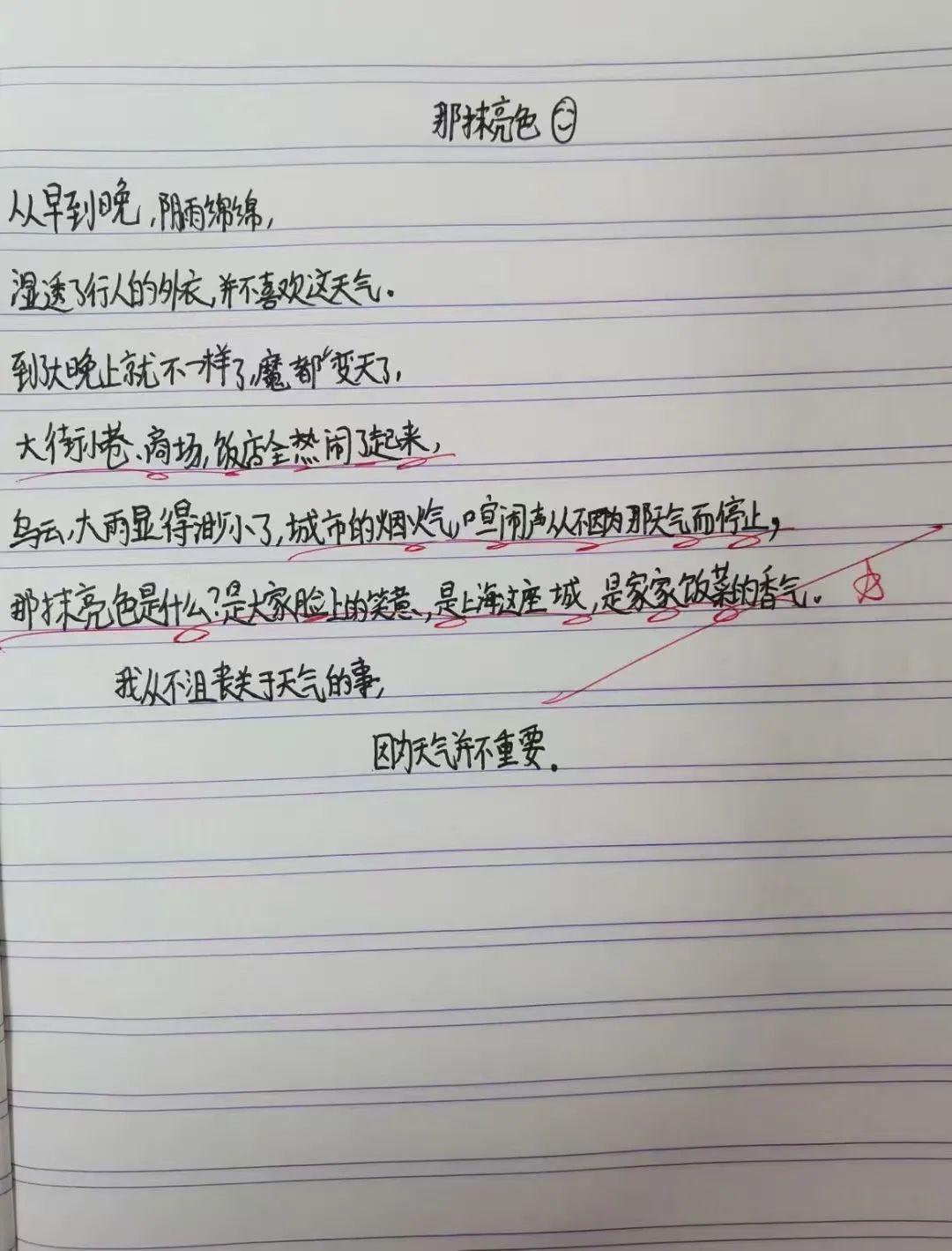 她会用红笔圈画令她惊艳的语句,并打上一个五角星,“中午,我会给出一个主题,不做任何指导,让孩子们自由发挥。我带的上一届学生是从四年级开始尝试写诗,这一届起步比较早,但我觉得孩子们完全可以做到。”