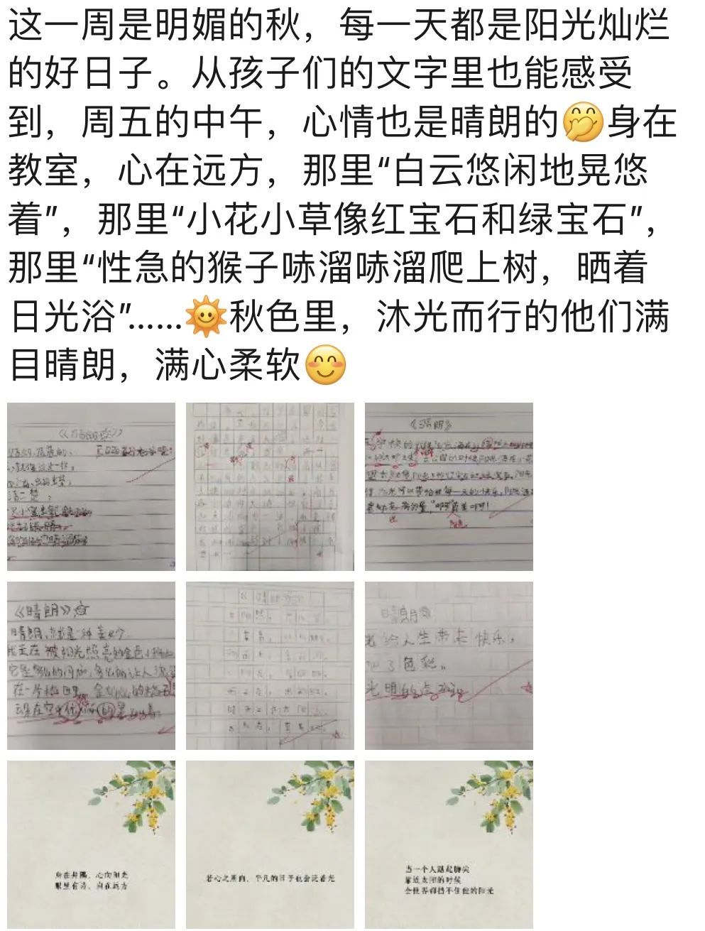 李莲是一名二年级班主任,翻开她的微信朋友圈,里面记录着班级学生写下的小诗,暴雨天、春分时节、公园里的桂花、生活中的烟火气等都能成为孩子的创作素材。