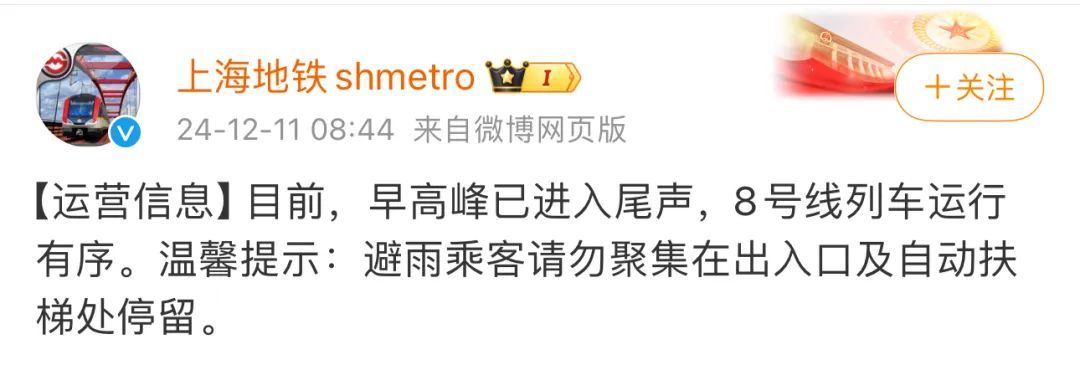 目前,早高峰已进入尾声,8号线列车运行有序。温馨提示:避雨乘客请勿聚集在出入口及自动扶梯处停留。