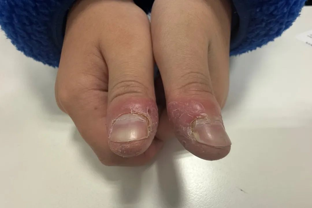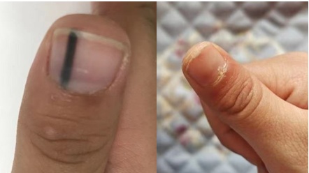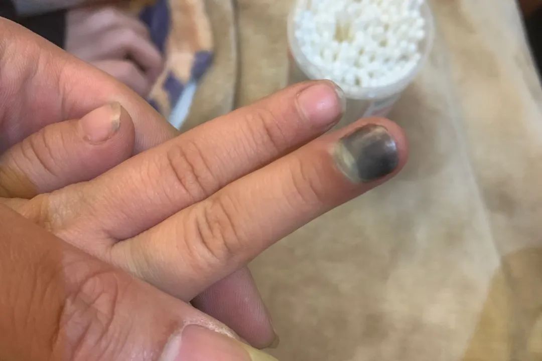 孩子活泼好动,也因此容易发生意外伤害,像是手指被车门、抽屉夹伤。在排除骨折的同时,往往忽略指甲的损伤,大面积的甲下积血需要积极治疗,如果没有及时处理,可能继发甲下感染,影响甲床,甚至造成后期指甲畸形的发生。(图 超过90%面积的甲下出血)