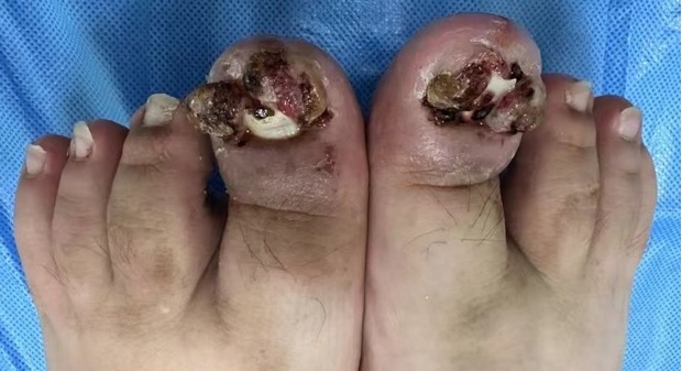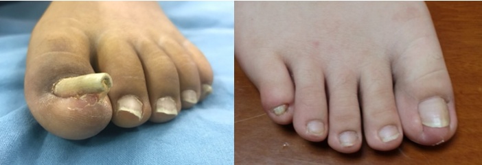 复杂甲畸形并不能通过拔甲矫正外形,新长出的指甲往往还会呈现异常外形,随着时间延长,会影响运动、走路、穿鞋。可以通过手术矫正,恢复外形,改善功能。(图 双足拇指甲畸形术前及术后随访,术后照片系病人提供,拍摄对侧足,两侧病变及手术方式相同)