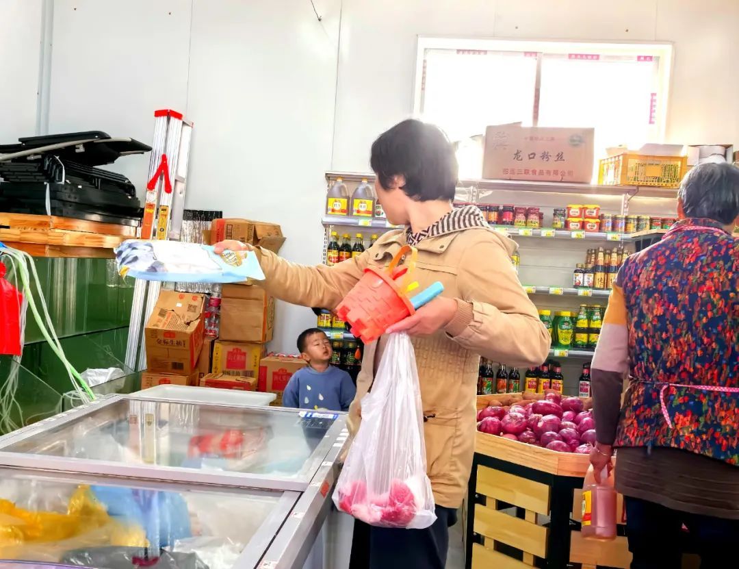 便利店位于东夏村东三296号,老远就能看见醒目的店牌——“便民生鲜店”,店牌上还标注了经营范围——水果、蔬菜、冷冻品、日用百货。周边没有其他楼栋,占地面积约105平方米的独栋小平房就是便利店的全部场地。店主周萍正热情地招呼村民,其中好几个都是购买猪肉的。“这里的猪肉新鲜,还可以提前预订。”一位带着孩子的女士说。忙着切割猪肉的店员接过话头:“村里销量不大,我们也不敢多进,大家要多少拿多少,都是当天天不亮去拿货。”