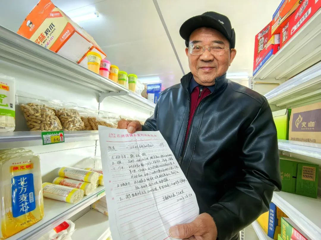 探访那天,陆进贤也特地赶到了便利店。一见到记者,老人家急切地从口袋里掏出一张纸,纸上一条一条罗列了便利店的好,甚至还取了个标题——《这爿便民生鲜店办得好》。话匣子也顺势打开:“品种齐全,价格公道,老板亲民近民,服务态度好,大家都特别满意……”