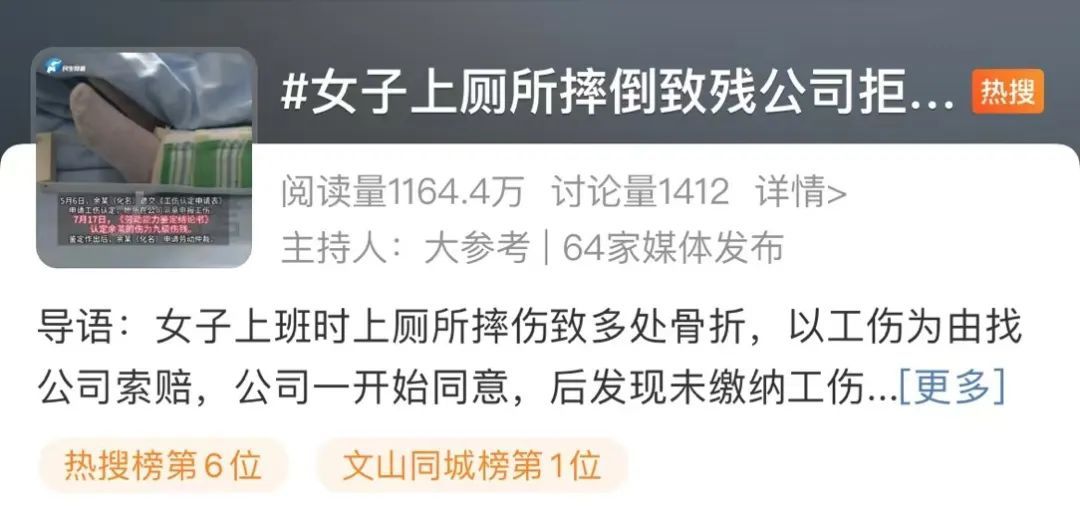 #女子上厕所摔倒致残公司拒赔20万#
