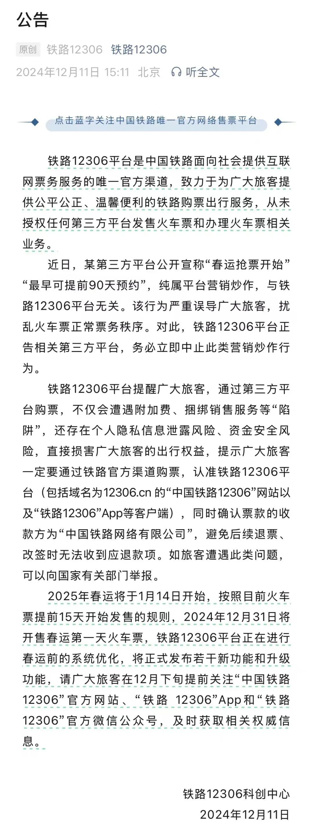 近日,“春运抢票开始” “最早可提前90天预约” 的消息在网络传播 一些网友疑惑: 火车票不是提前半个月才售票吗? 12月11日下午 铁路12306科创中心 紧急发布《公告》称 某第三方平台公开宣称“春运抢票开始”“最早可提前90天预约”,纯属平台营销炒作,与铁路12306平台无关。该行为严重误导广大旅客,扰乱火车票正常票务秩序。 据《公告》,2025年春运将于1月14日开始,按照目前火车票提前15天开始发售的规则,2024年12月31日将开售春运第一天火车票,铁路12306平台正在进行春运前的系统优化,将正式发布若干新功能和升级功能。 12306提醒广大旅客: 铁路12306平台是中国铁路面向社会提供互联网票务服务的唯一官方渠道。 通过第三方平台购票,不仅会遭遇附加费、捆绑销售服务等“陷阱”,还存在个人隐私信息泄露风险、资金安全风险,直接损害广大旅客的出行权益。 来源:新闻坊、铁路12306 编辑:焦倩倩