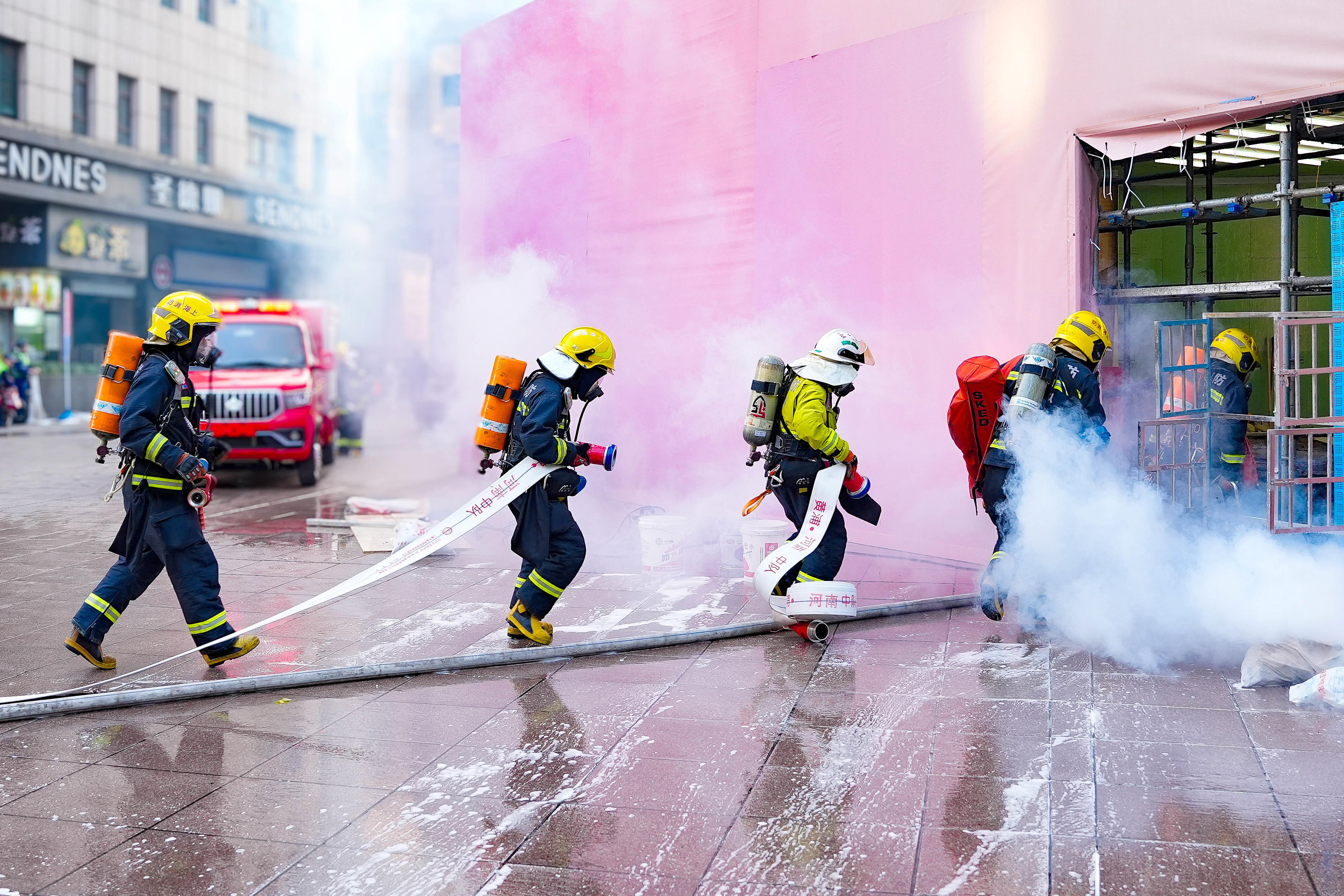 与此同时,正在南京路步行街执行巡逻任务的公安巡逻中队以及消防 “蓝焰 119” 自行车骑行队在发现灾情后,即刻依据各自的职责分工,迅速展开行动。公安巡逻中队全力开展人流控制与疏导工作,确保现场秩序井然,避免恐慌造成的混乱局面;而消防 “蓝焰 119” 自行车骑行队则迅速投入灭火处置工作,与各方力量形成互补。然而,由于天气状况、风力影响以及高层建筑外立面特殊结构等多种不利因素的共同作用,火势并未得到有效遏制,反而进一步急剧发展扩大,熊熊烈焰沿着外立面一路向上、向内疯狂蔓延。在这千钧一发之际,作为全区灭火救援力量体系重要组成部分的外滩街道社区微型消防站接警后迅速出动,其 “小、快、灵” 的电瓶车以及各类专用车辆风驰电掣般先后抵达现场,义无反顾地投身到灭火救援的紧张战斗之中。
