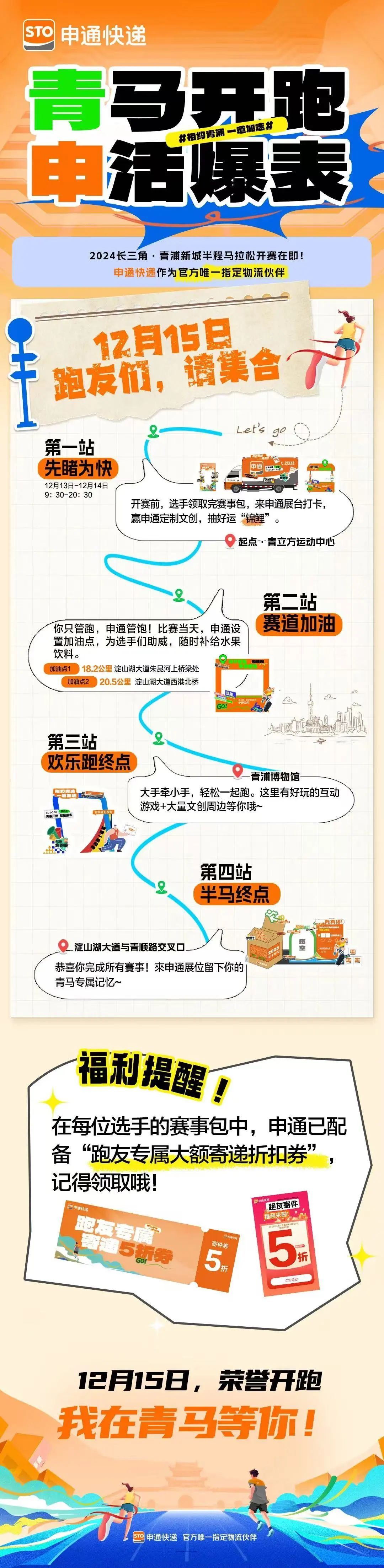 2024年长三角•青浦新城半程马拉松比赛即将开赛!申通快递作为本次赛事官方唯一指定物流伙伴,将提供全流程、全链路赞助。