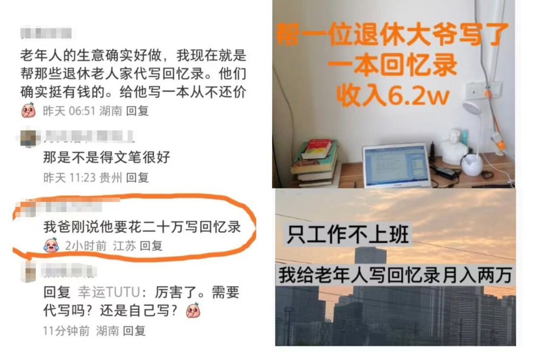 “在最困难的时候,靠给老人写传记,赚了18万”,“明微”分享的帖子热度很高。明微讲述,自己在传统纸媒摸爬滚打了12年,创业失败后,常年写作人物专访的她决定回归“老本行”。“来找我写回忆录的老人基本在70岁到80岁之间,他们一方面自我意识比较强,另一方面,他们的经历伴随着新中国成立以及后来的发展,对国家的感情都很深,很有家国情怀。”