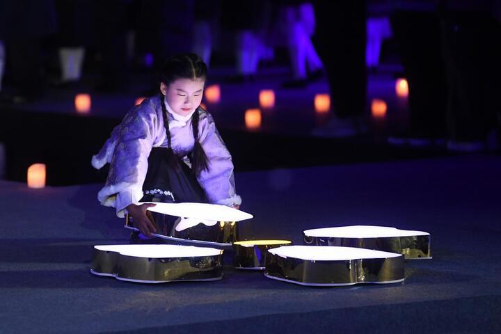 伴随金陵中学实验小学学生们演唱歌曲《感同身受》的旋律,南京大屠杀幸存者马秀英的重孙女马雯倩、医护代表、志愿者代表和学生代表4位代表手捧紫金草花瓣灯箱,依次走向“紫金草女孩”。四片紫金草花瓣被放置于和平女神像下,一朵闪耀着和平之光的紫金草绽放,和平的种子在这片热土生发。霎时间,无数闪耀着和平之光的紫金草璀璨盛放,环绕在和平女神像周围的点点微光汇成星河,见证着铭记历史、珍爱和平的誓言。