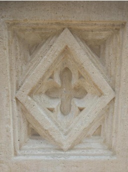 外立面采用暗红色耐火泰山砖墙面,屋顶有两处三角形山墙及雉堞女儿墙,一、二层联通窗套,二层窗下有带尖券花饰,顶部檐口有雉堞处理,山墙中间带有葡萄藤装饰图案,门、窗套间带有基督教符号的建筑盾牌形纹章装饰图案。