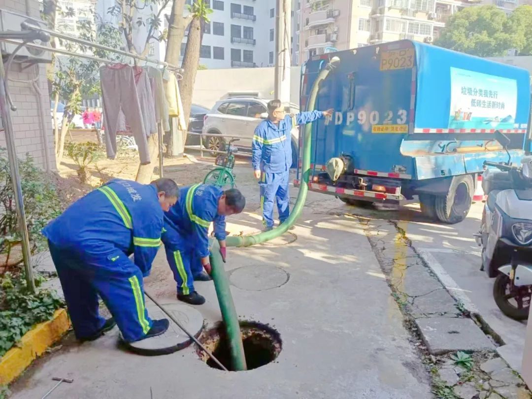 原来,文致、祥德两个居民区均为老旧小区,其纳污管道设施因年久失修而发生堵塞,粪坑出现满溢,即便在正常清运的情况下也无法解决,居民们对此苦不堪言,相关居委会于是向虹腾保洁公司求助。