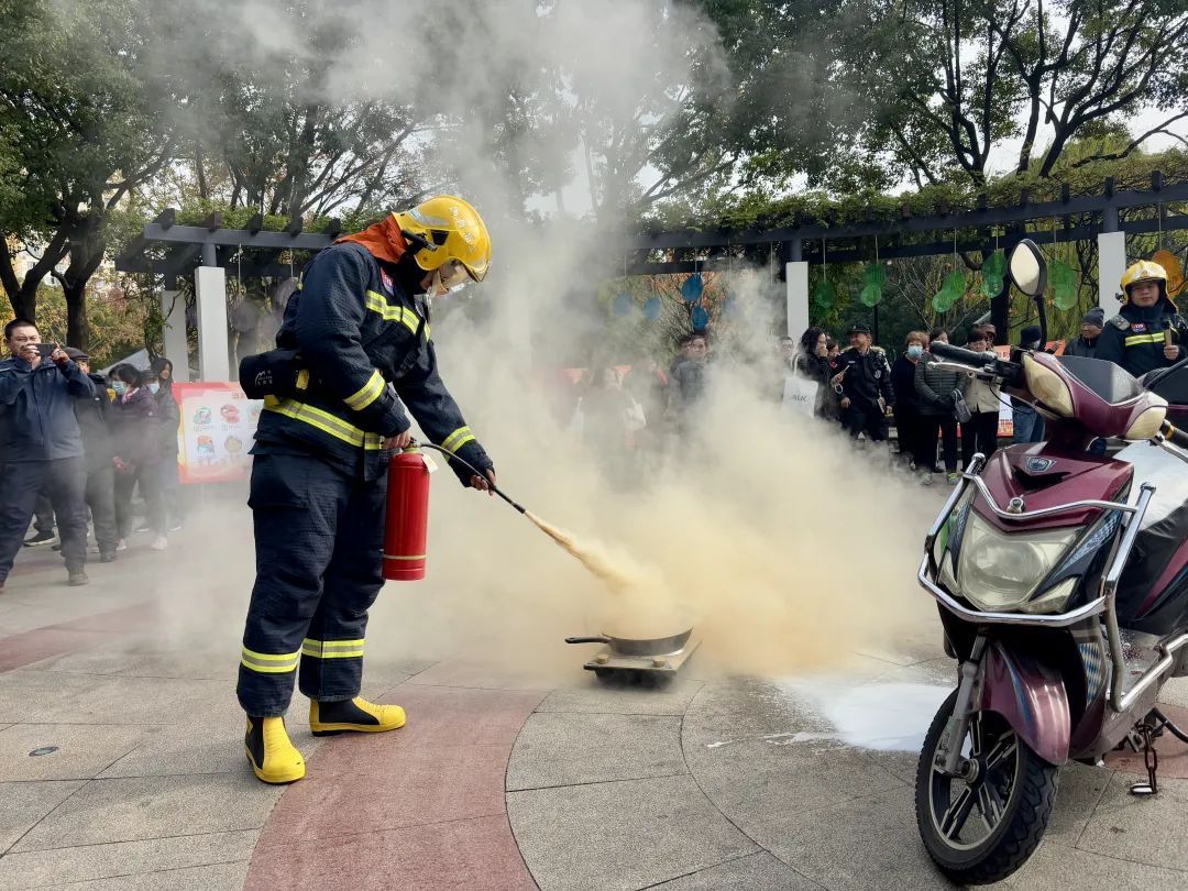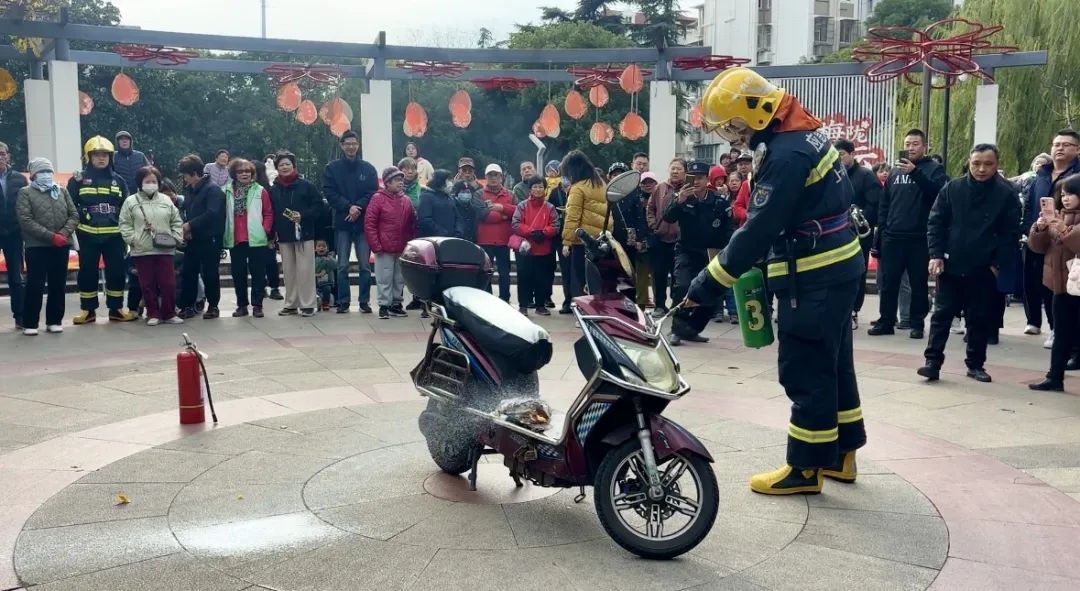 消防队员们针对冬季常见的电动车起火和厨房油锅起火等情况,在嘉川路小游园进行现场演示,展示了正确的应急处理方法。据消防员介绍,生活中常见的电瓶车自燃和爆炸基本是由锂电池内部短路引起,使用干粉灭火器不仅无效,反而可能加剧险情。现场,消防员向居民们介绍了电动车灭火专用的水基灭火器,并通过“提拔握压”的口诀(即提起灭火器,拔掉保险栓,握住喷嘴,压下压把),向民众们详细讲解了灭火器的操作步骤。
