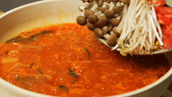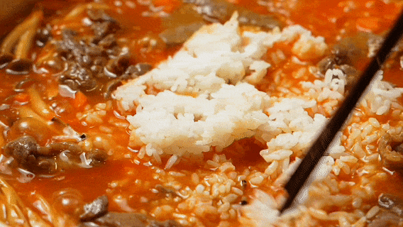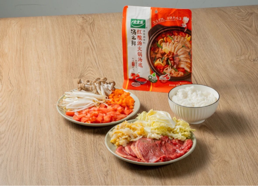 蟹味菇30克、胡萝卜30克、豆芽30克、番茄50克、米饭100克、白菜30克、蒜末10克、酸菜30克、牛肉片120克、火锅汤底调味料1袋