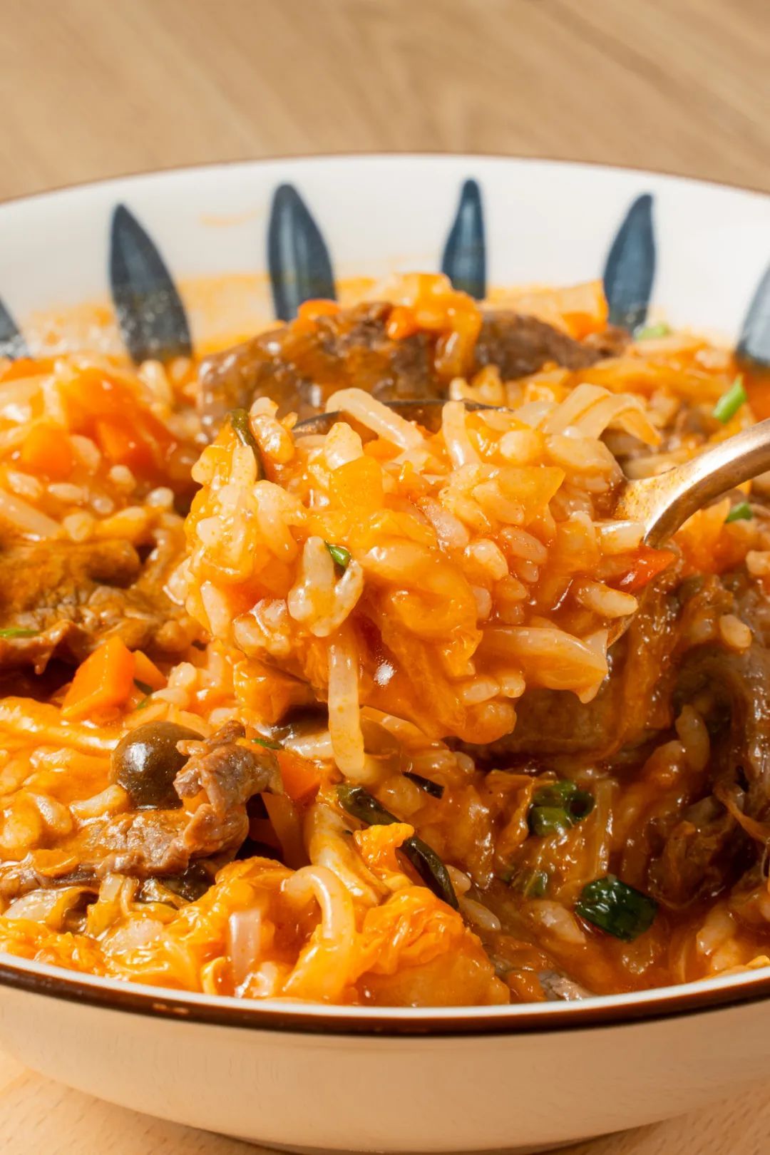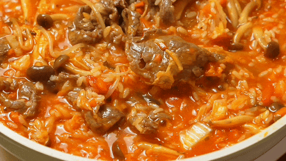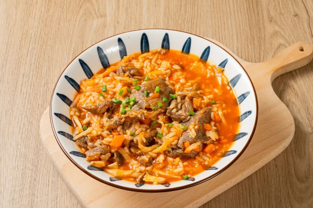 4.倒入米饭和牛肉翻炒均匀,中火收浓汤汁即可。