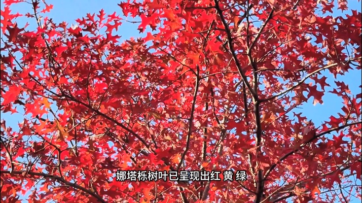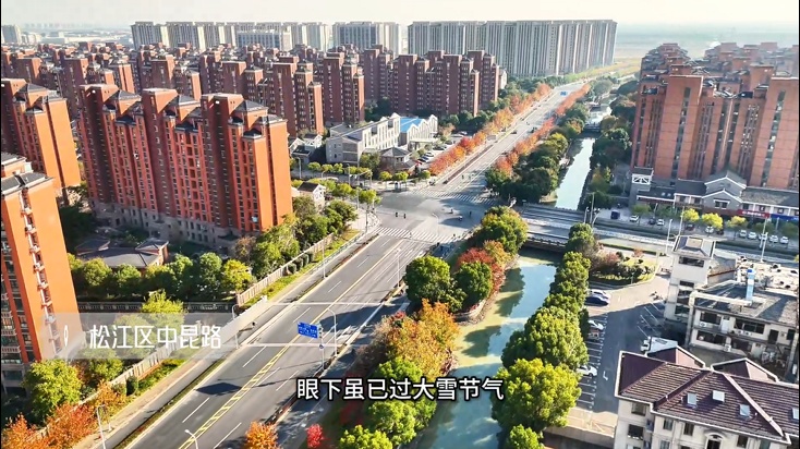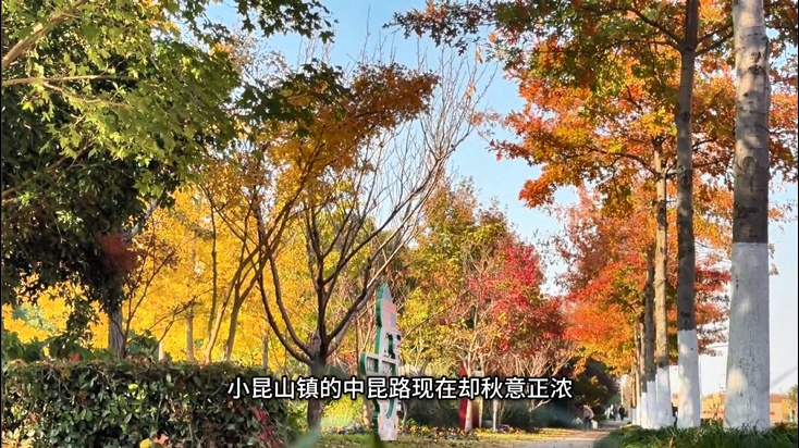 眼下虽已入冬,小昆山镇的中昆路现在却秋意正浓。一眼望去,娜塔栎树叶已呈现出红、黄、绿三种颜色相间的暖色调,与周围的红墙建筑交相辉映,宛如一幅打翻了调色盘的梦幻画卷,漫步其间,万叶婆娑,满目皆是醉意。中昆路西侧的新建河公园沿河而建,形成了一条长约700米的滨水绿化景观带。园内设置了凉亭、步道等设施,并种植了不同种类的树木和花卉,形成了一处可休憩、可游玩的绿色空间。