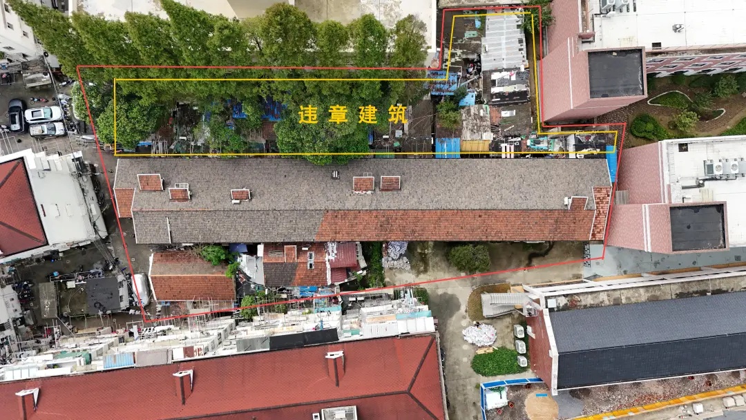 而楼的南侧,则是另外一幅场景。23个违搭建筑,大大小小,见缝插针地排列着。有的居民为了解决生活所需,在一楼门外均搭建起了厨房、卫浴等空间,有的则在二楼搭建起了小阁楼,用于居住或者出租,安全隐患非常大。