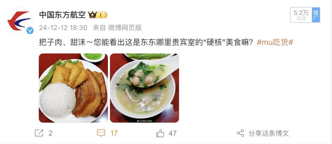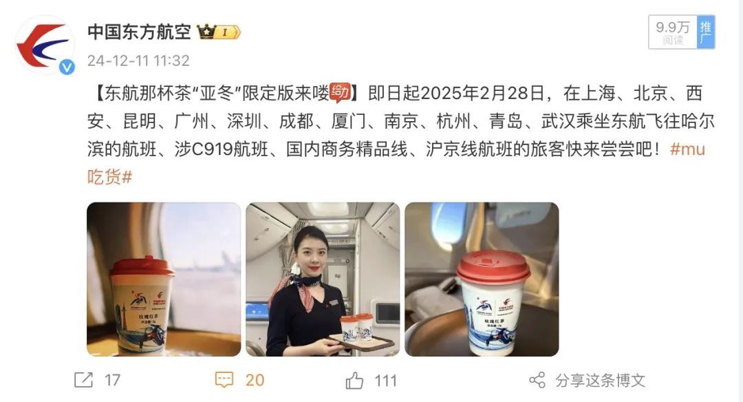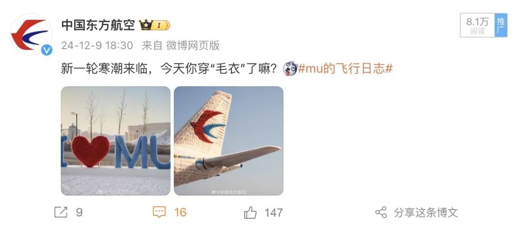 微博共发布16条内容,总流量79.5万。其中,“寒潮来临,你‘穿’毛衣了嘛”、“东航那杯茶‘亚冬’限定版”、“贵宾室的‘硬核’美食”获得了更多的曝光量。
