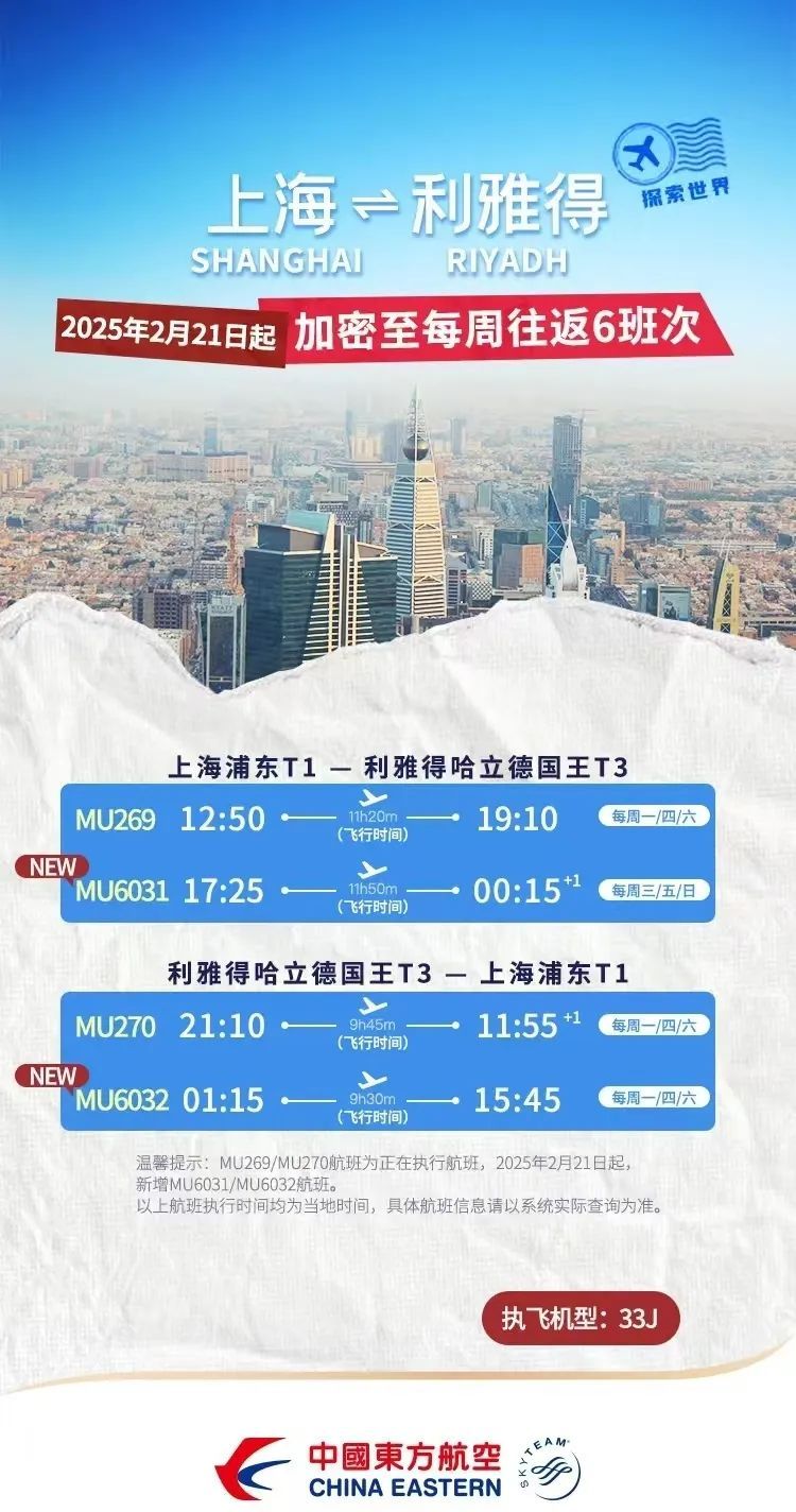 自2025年2月21日起,东航将加密上海—利雅得直飞航线,从每周3班往返增至每周6班往返。