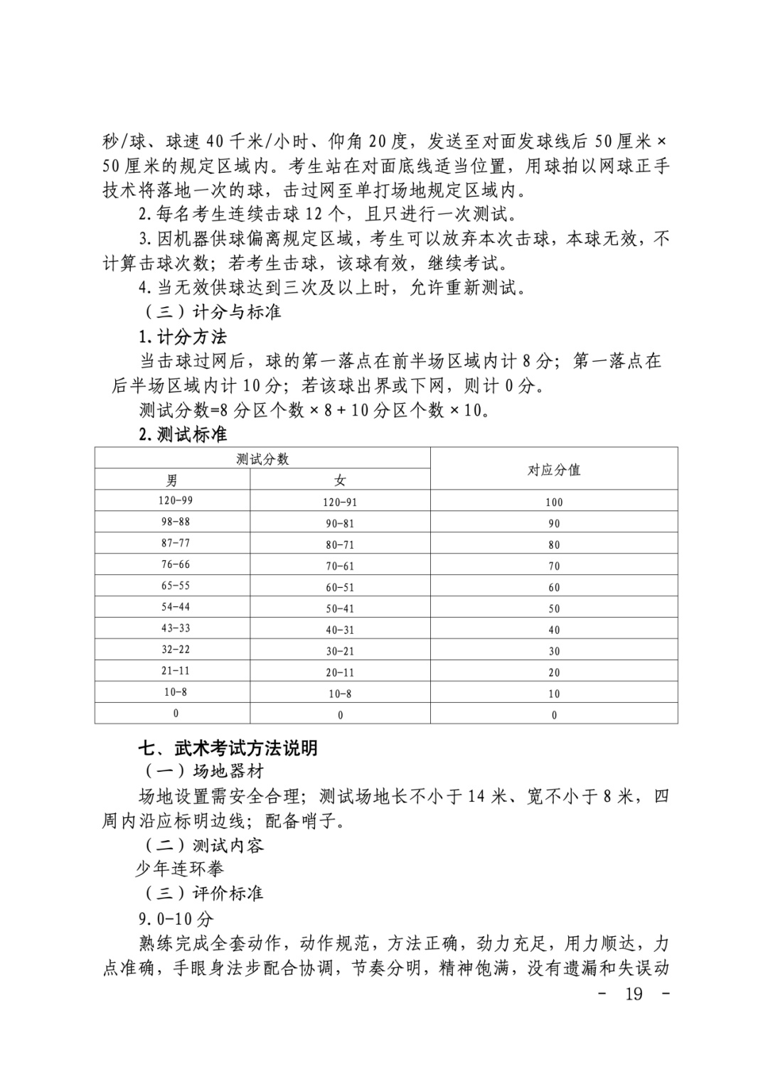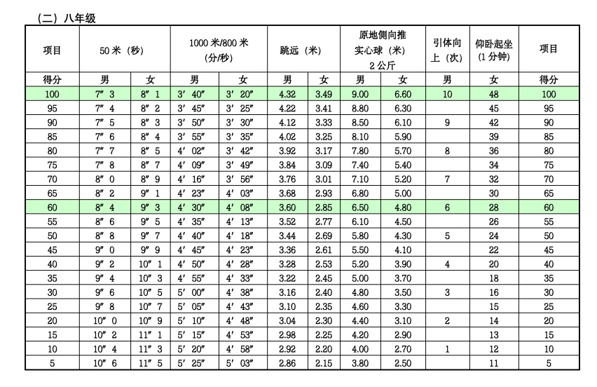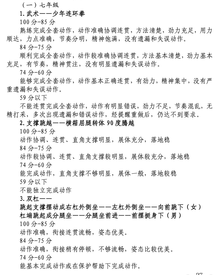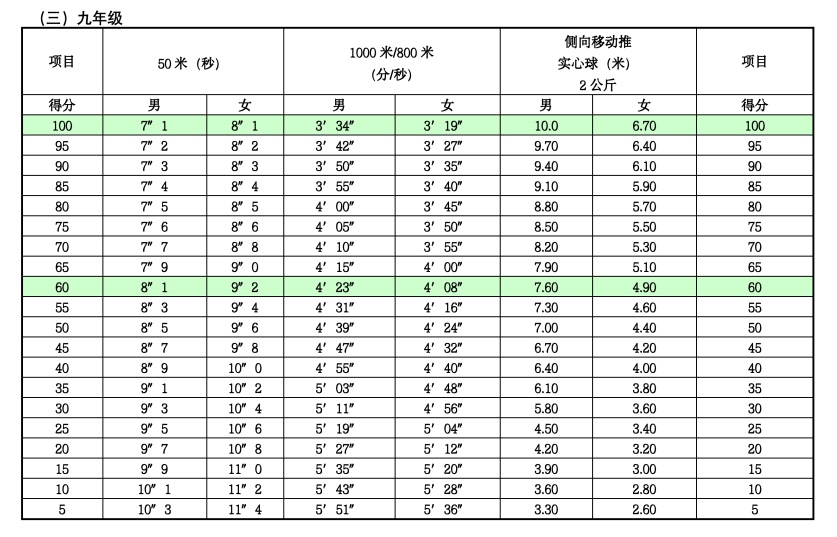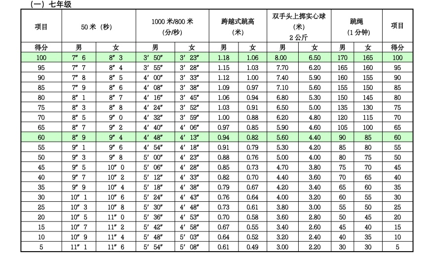 体育统一考试项目成绩评价标准