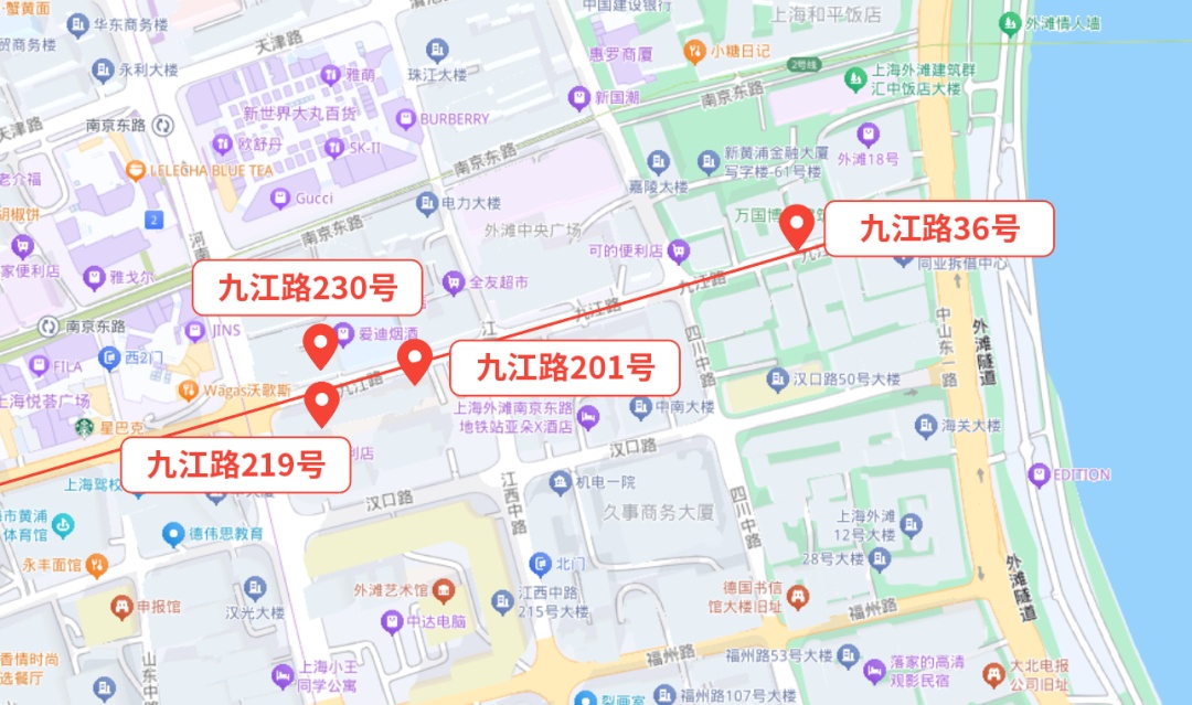 外滩“第二立面”东至圆明园路-天津路-四川中路,西至河南中路,南至延安东路,北至南苏州路。这样的地理位置使得它成为连接外滩与周边区域的重要纽带。九江路作为这一地块的中心地带,更是承载着丰富的历史文化和现代商业气息。沿着这条有着近160年历史的马路漫步,来一睹其中四幢优秀历史建筑的百年风姿——九江路36号、九江路201号、九江路219号、九江路230号。详见↓