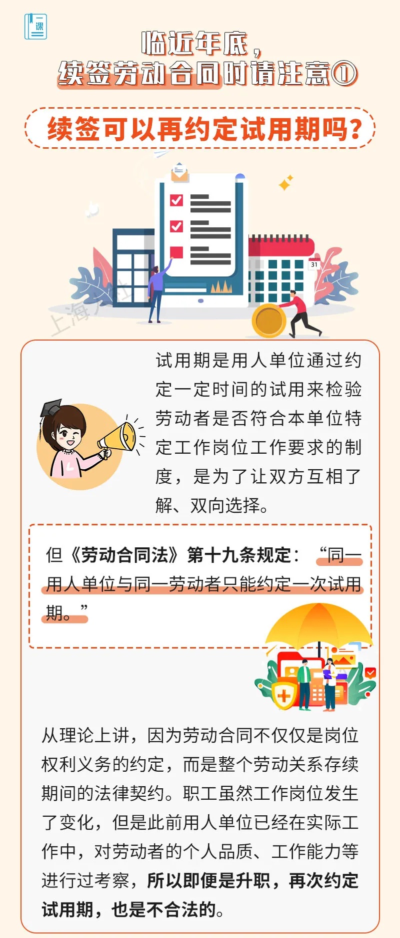 临近年底,又到了很多人续签劳动合同的时候,许多疑问随之而来:续签合同可以再约定试用期吗?若单位不再续签,需要支付经济补偿吗?如果劳动者还在医疗期内,合同是否能得到顺延……关于这些问题,一起来看市人力资源社会保障局的解答↓