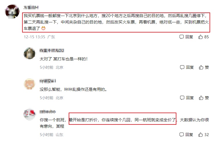 一位博主分享了自己的经历:初次搜索机票时,直飞航班的最低价格高达4309元,但她通过反复留言表达价格过高的不满后,机票价格竟奇迹般地降至1903元,节省了整整3000元。原来,她通过此举改变了系统对她的用户画像,从“高消费旅行者”转变为“价格敏感型旅行者”,从而成功促使票价大幅下降。