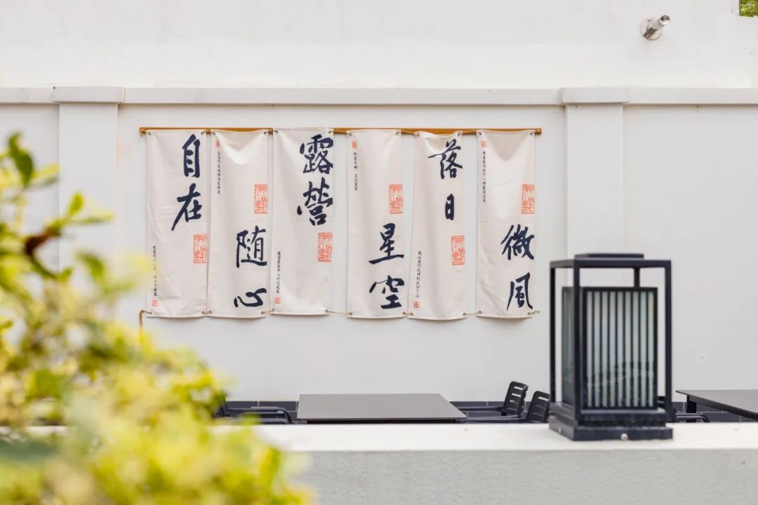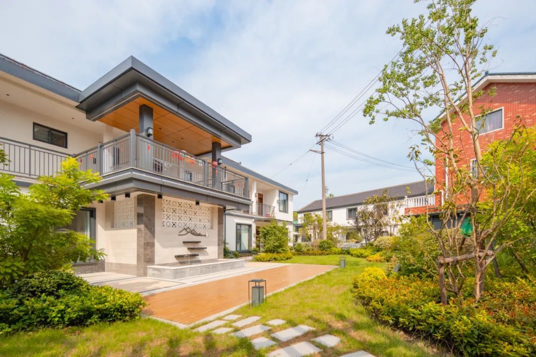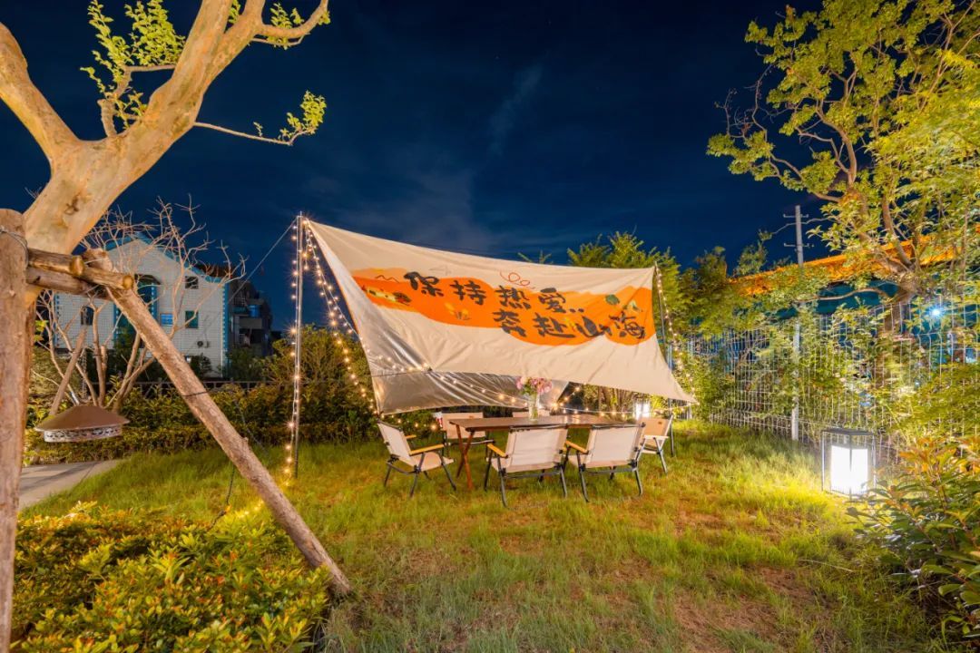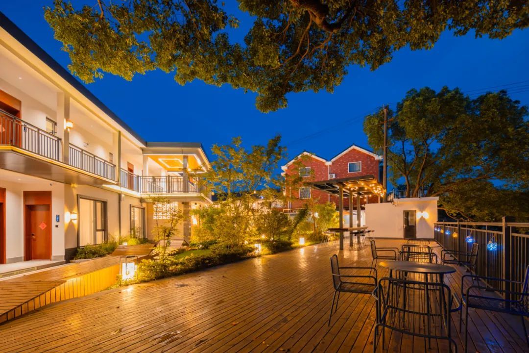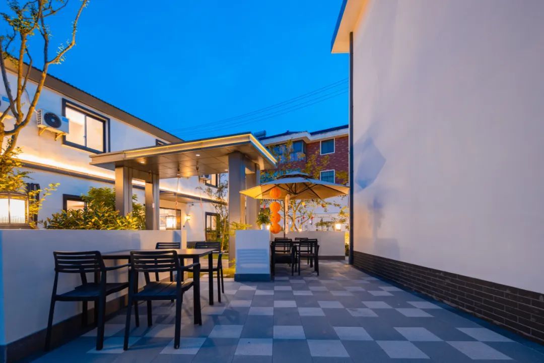 走进民宿内部,映入眼帘的是一个园林风格的庭院设计,潺潺流动的河水环绕房屋四周,搭配户外烧烤区、草坪休闲区以及露天电影区等在内的约1360平方米公共区域,为游客提供了一个远离城市喧嚣的理想度假场所。